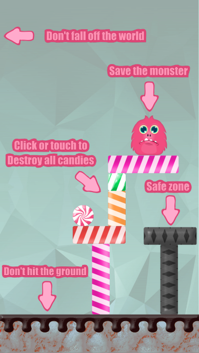 Candy Monster is a fun game with excellent graphics, The goal of the game is to clear all the candies from the level avoiding the monster fall to the ground. There are 20 levels for you to complete. The game was made using the program Construct 2, included capx file.