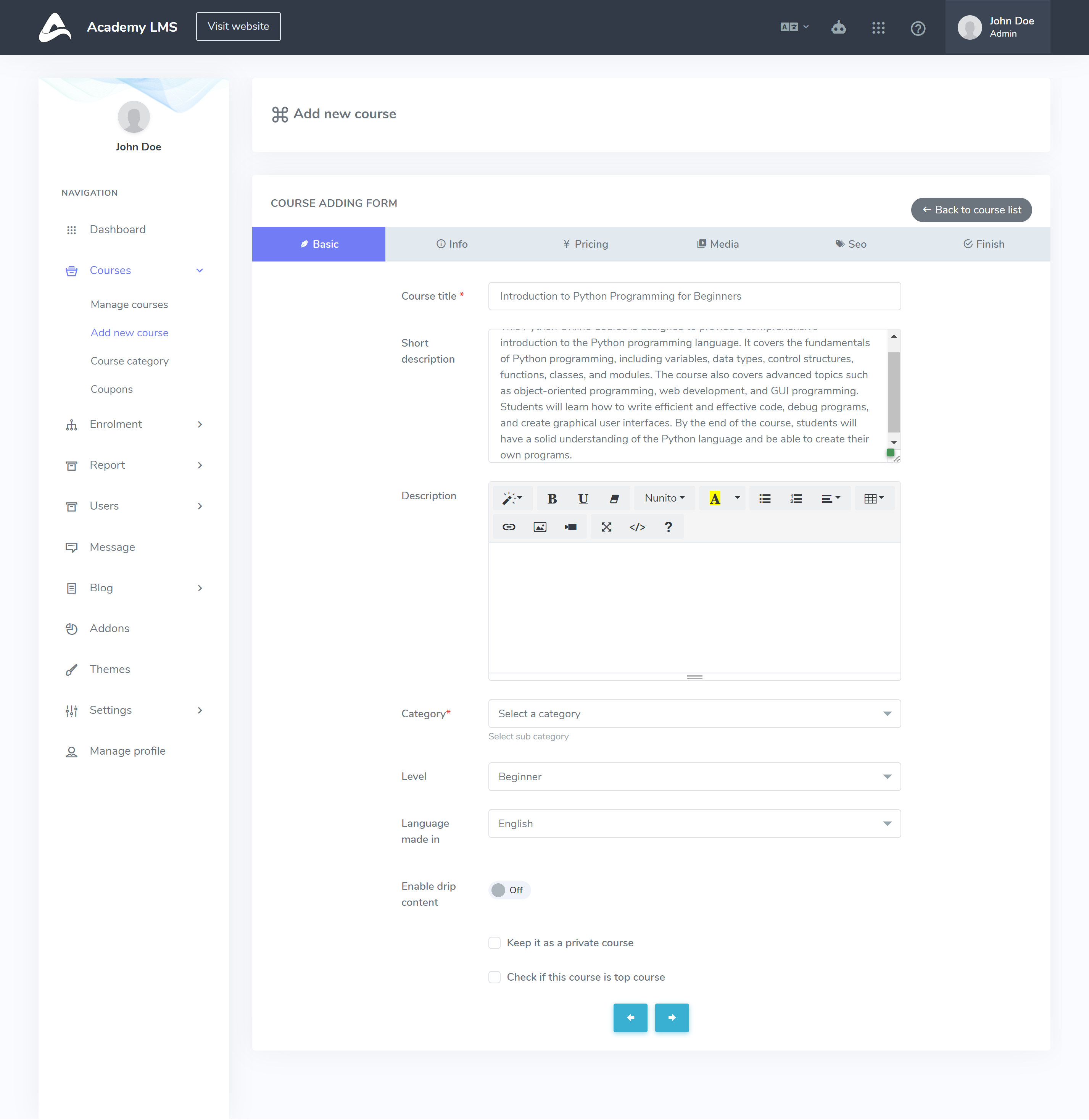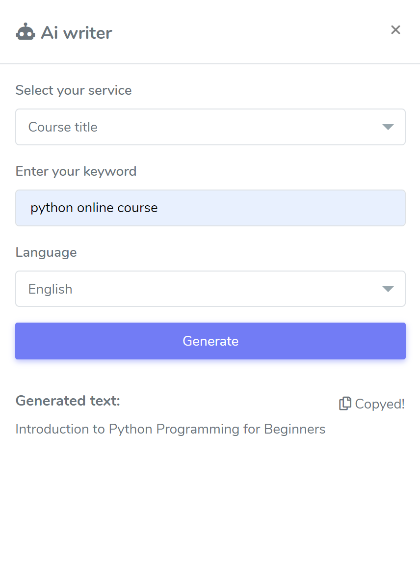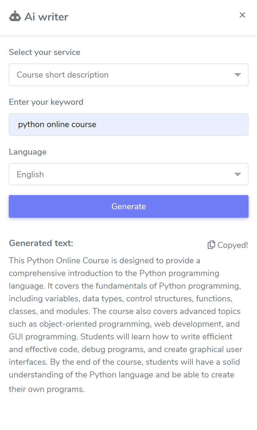 This addon provides content generation facilities for course, certificate, blog for Academy LMS powered course website. Using this addon, admin and instructor can generate a Course title, Short description, long descriptions, Course requirements, Outcomes, SEO tags, Quiz, Certificate text, blog, and course thumbnail. Which results in significant time savings and increased creativity.