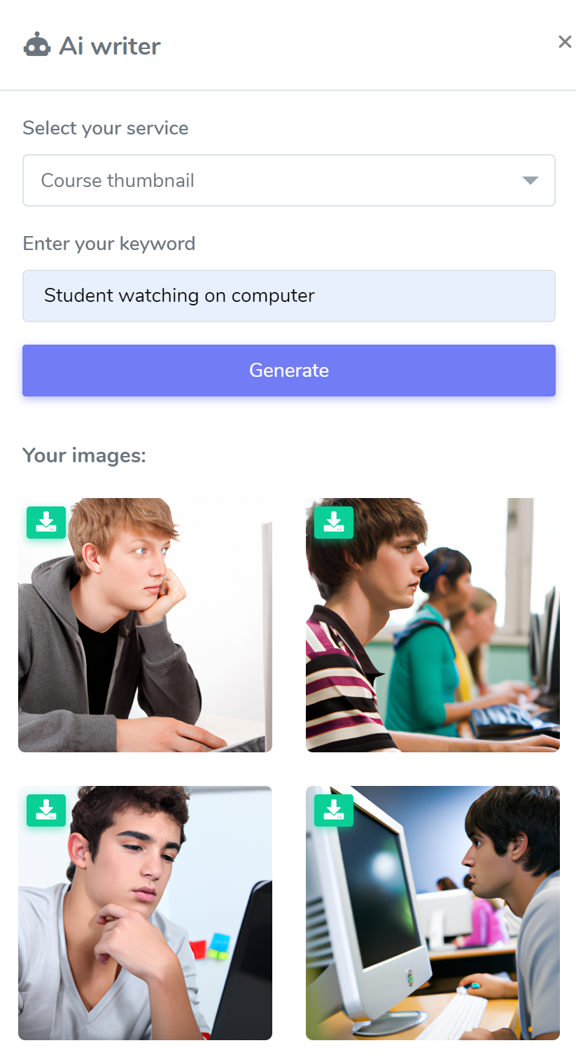Watch this addon demo by navigating to the link below: Login as admin or instructor. Navigate to admin panel, then click on the robot icon at top header bar. You will see the OpenAI panel to generate texts and images.https://demo.creativeitem.com/academy