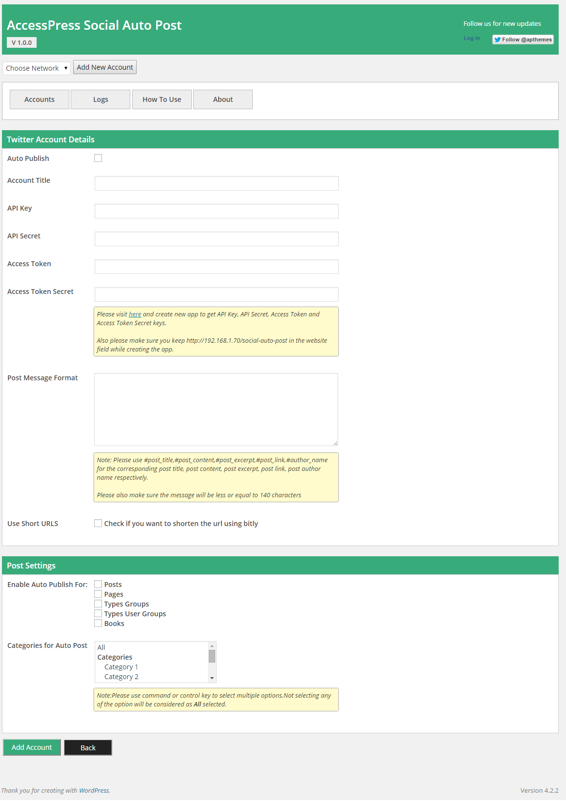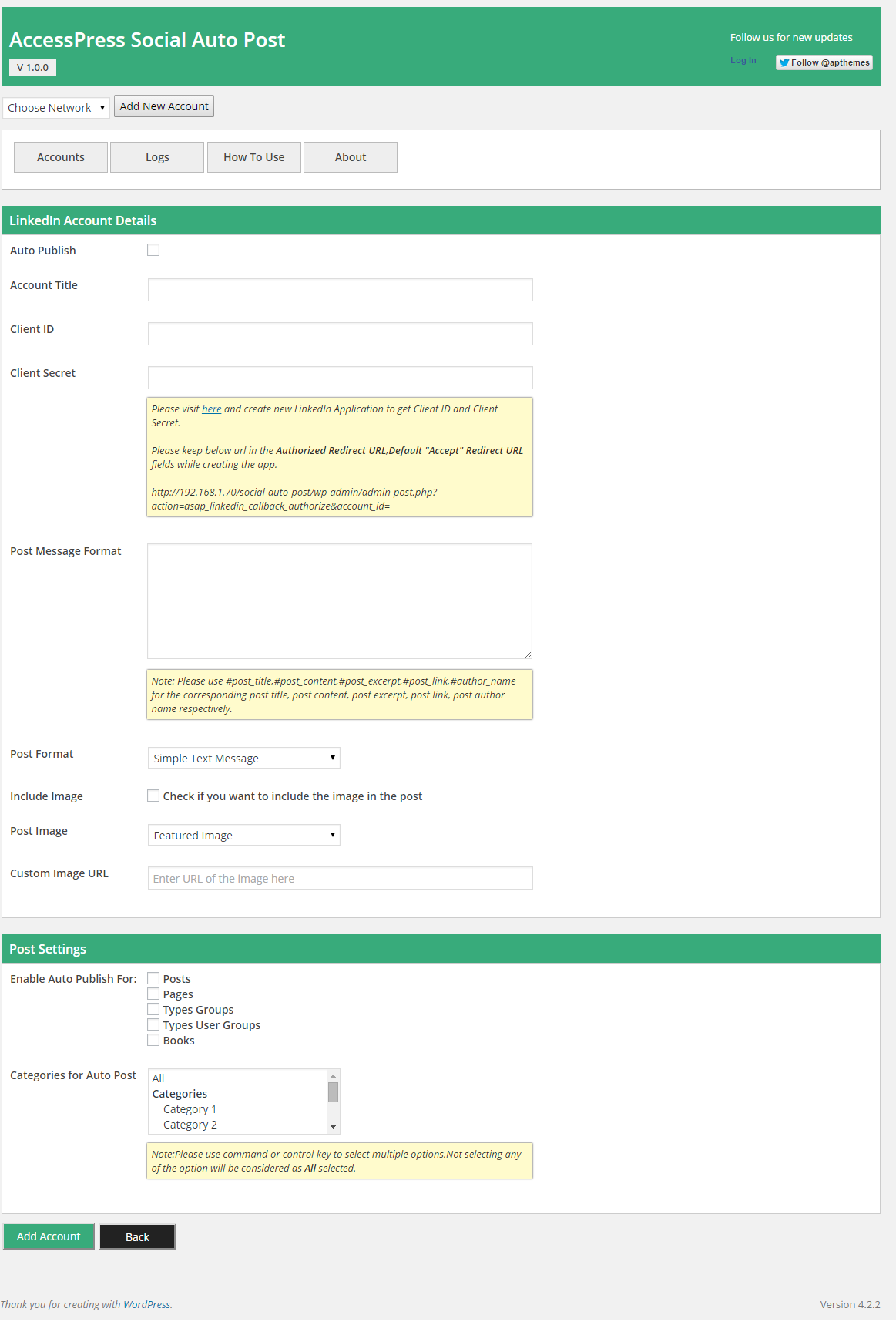 - Configure your social accounts on which you want to auto post. Eg. configure your Facebook, Twitter, LinkedIn, Tumblr accounts. If needed multiple/unlimited of each.