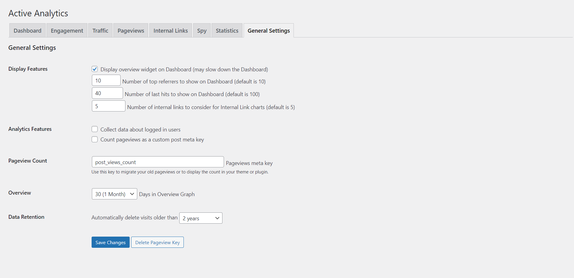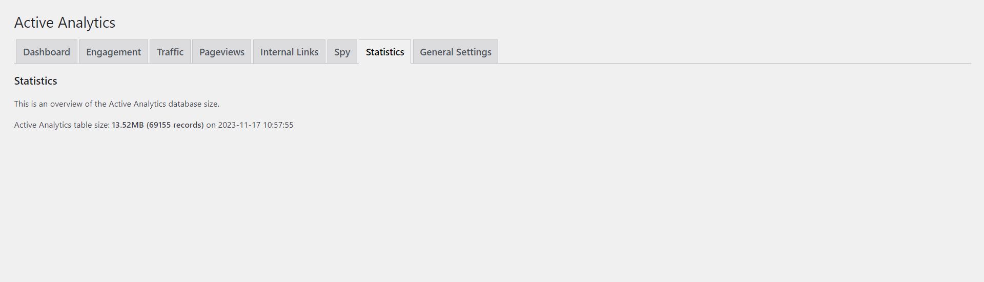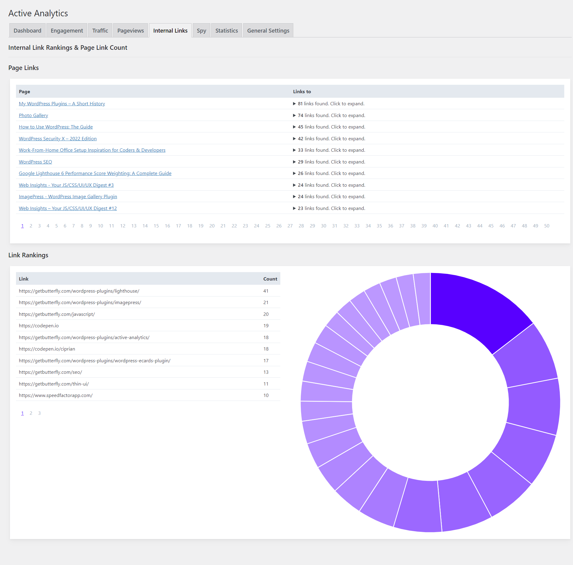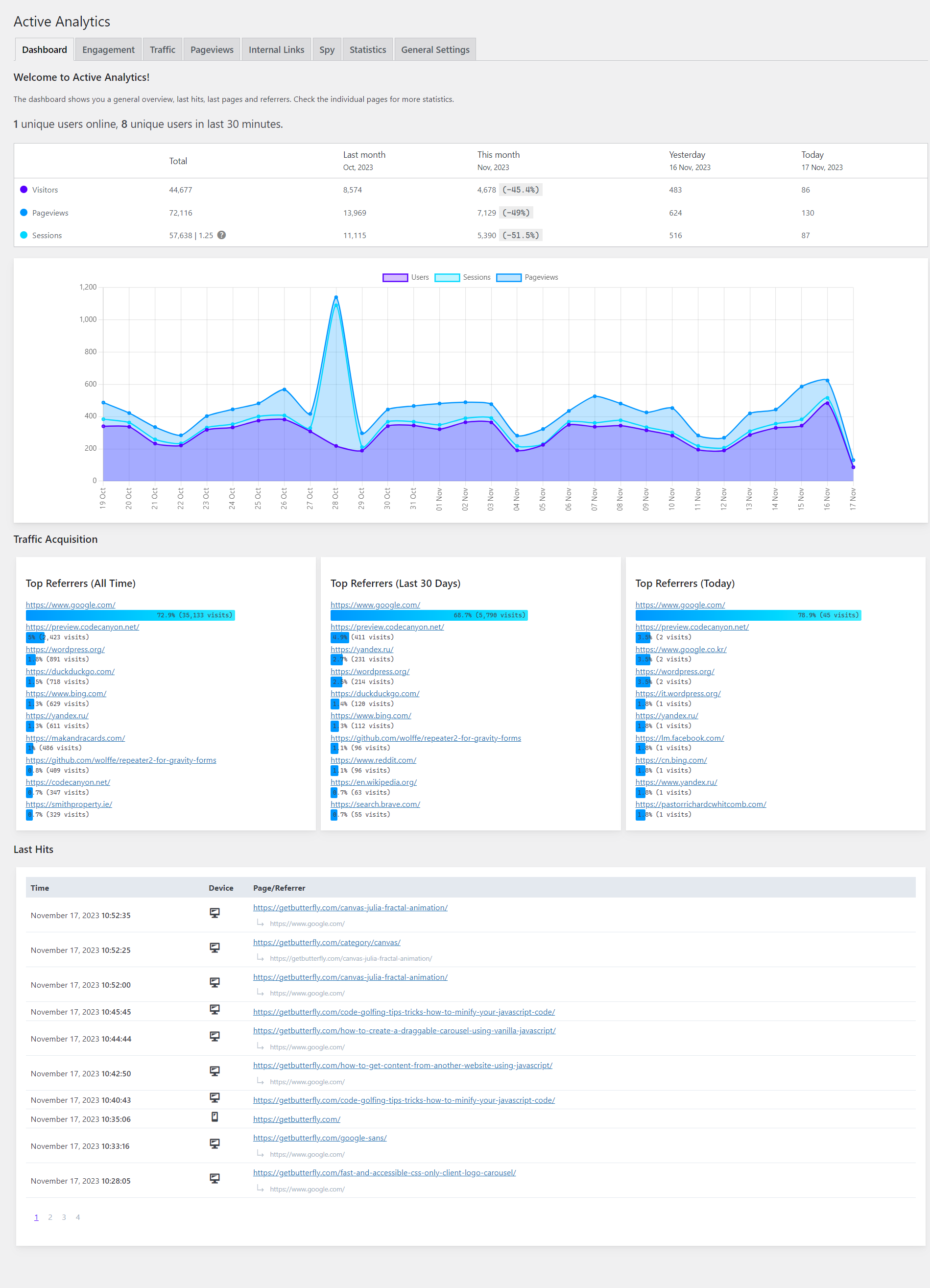 Active Analytics is a WordPress-tailored analytics plugin, privacy-enhanced, lightweight solution for tracking what really matters: real time activity, most visited pages, the best referrers and day-to-day/month-to-month users/pageviews statistics.