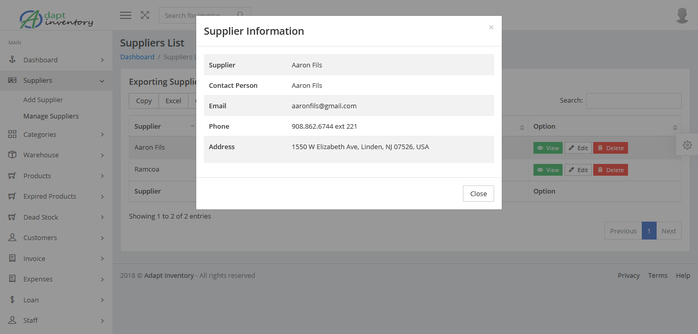 Adapt inventory system is the feature rich solution for businesses, which offers easy to use admin management, invoice management, suppliers management, products cataloging, categories management, warehouse management, expenses management, loans management, staff management, customer management, extensive reports management and system configuration.