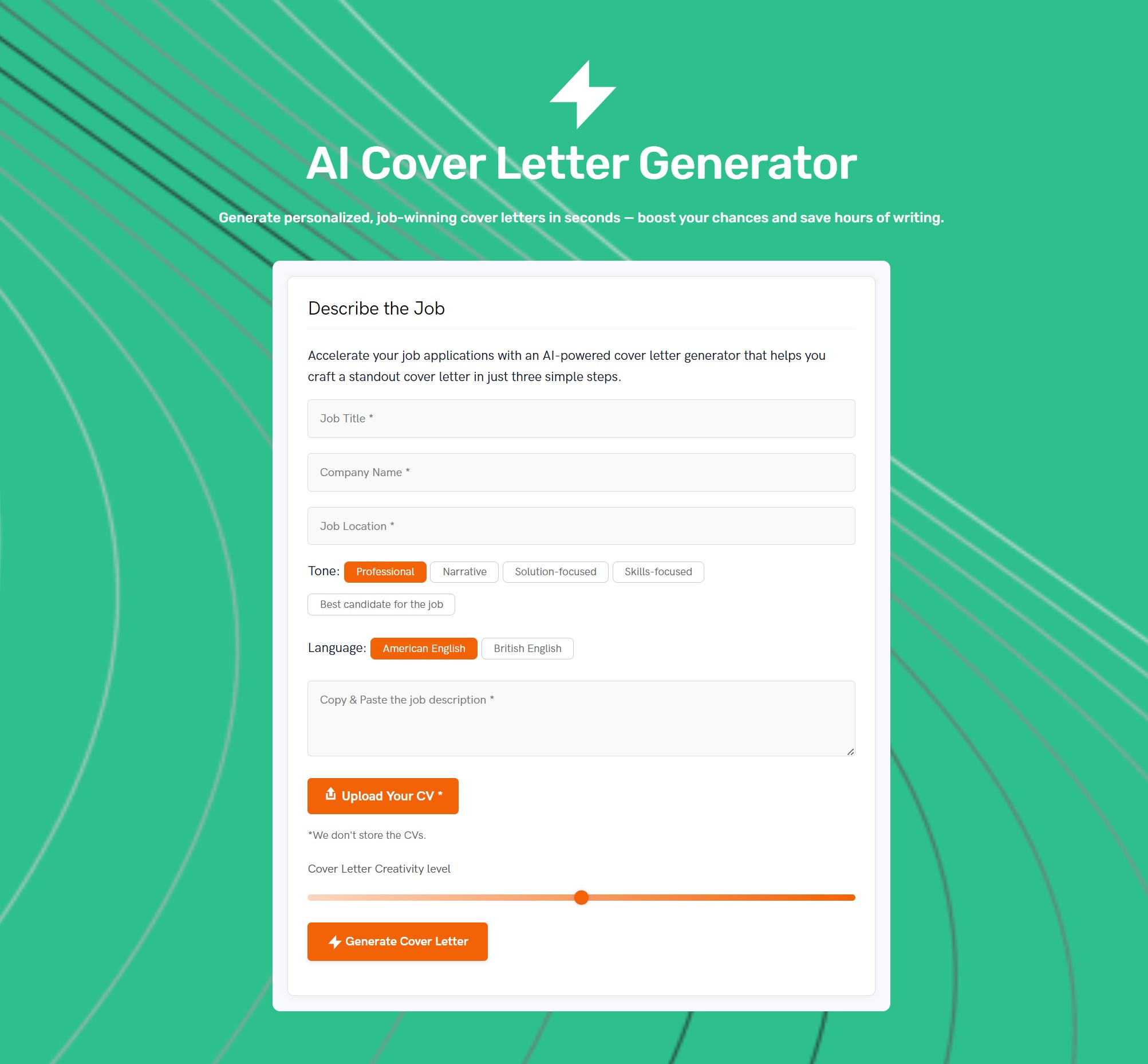 Use the slider to adjust the creativity level of your cover letter. A lower value will generate a more formal, structured letter, while a higher value will offer a more unique and expressive one. Once you’re ready, click the Generate Cover Letter button and let the AI create your custom letter.
