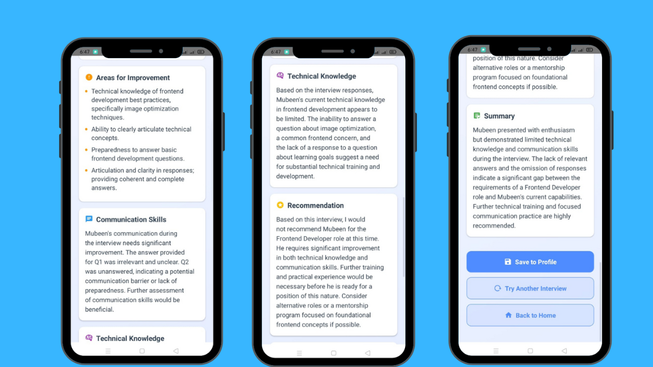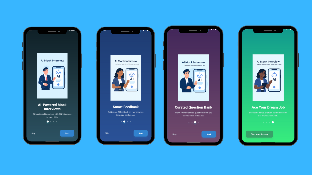 AI Mock Interviewer is a powerful cross-platform app built with React Native (for both iOS & Android) that helps job seekers practice, prepare, and improve their interview performance. It combines AI-driven features such as real-time mock interviews, CV analysis, and face analysis with a modern, responsive, and user-friendly design.