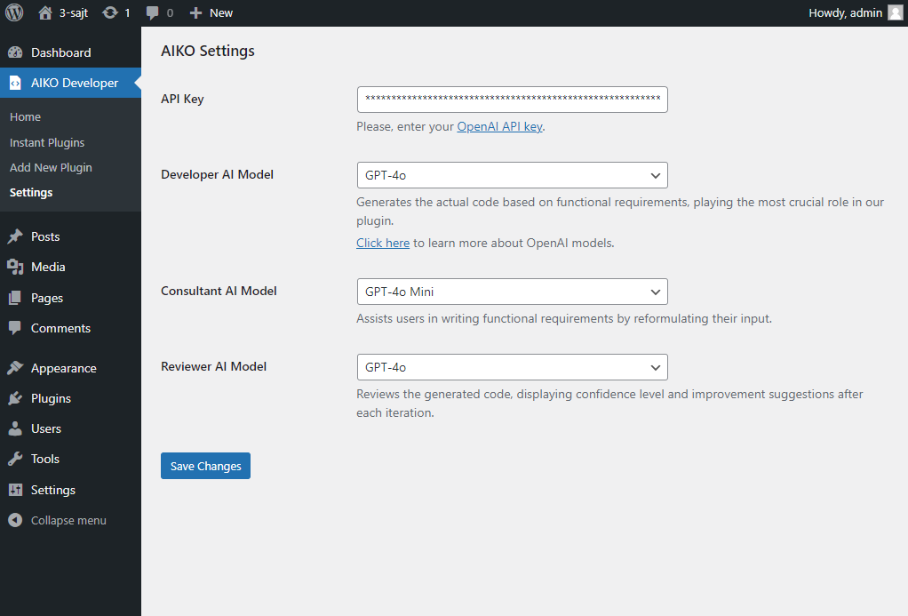 - AIKO uses various AI models to create unlimited custom WordPress plugins for admins, It’s designed for users with no programming experience