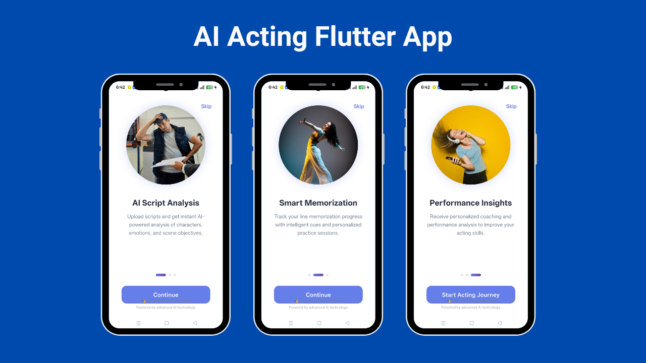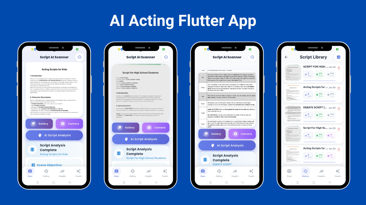 - This package provides all essential features of the AI Acting Flutter App, including Onboarding, Script Scanner, Script History, Script Results, Script Details, Script Analytics Dashboard, and AI Acting Assistant.