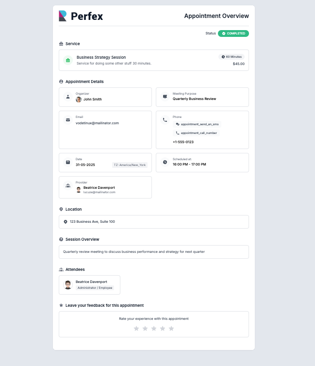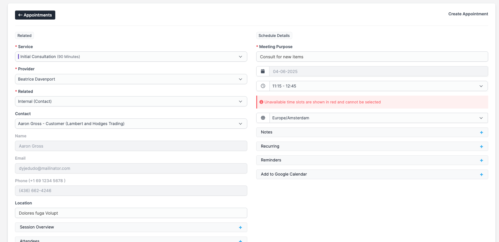 - Google Meet Integration: Automatic meeting links with custom email invitations for virtual appointments