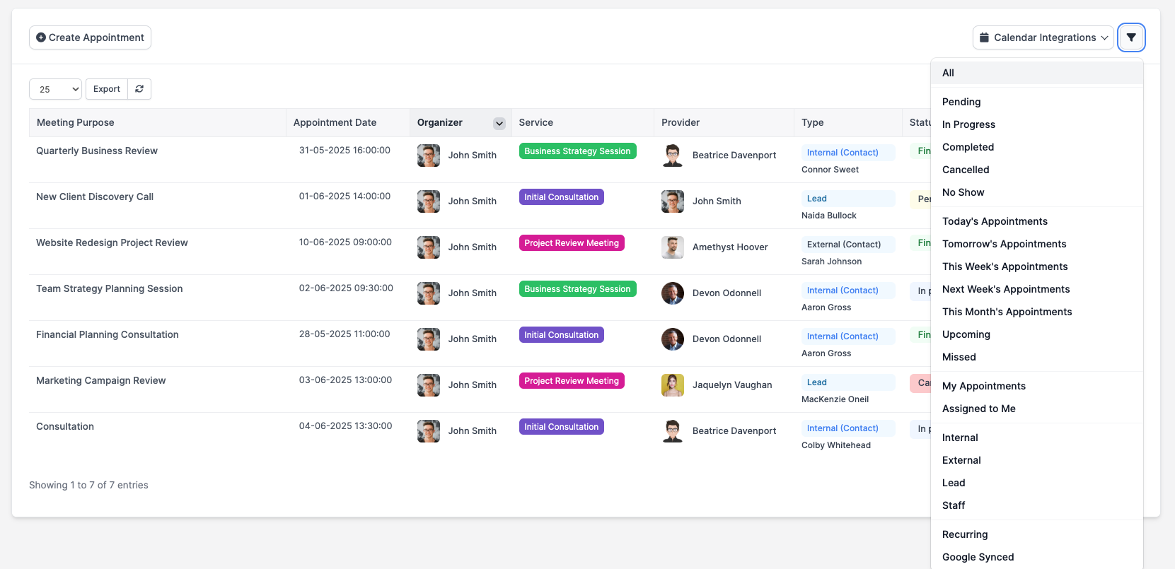 - Multiple Appointment Types: Internal (staff, contacts, leads) and external appointment booking options