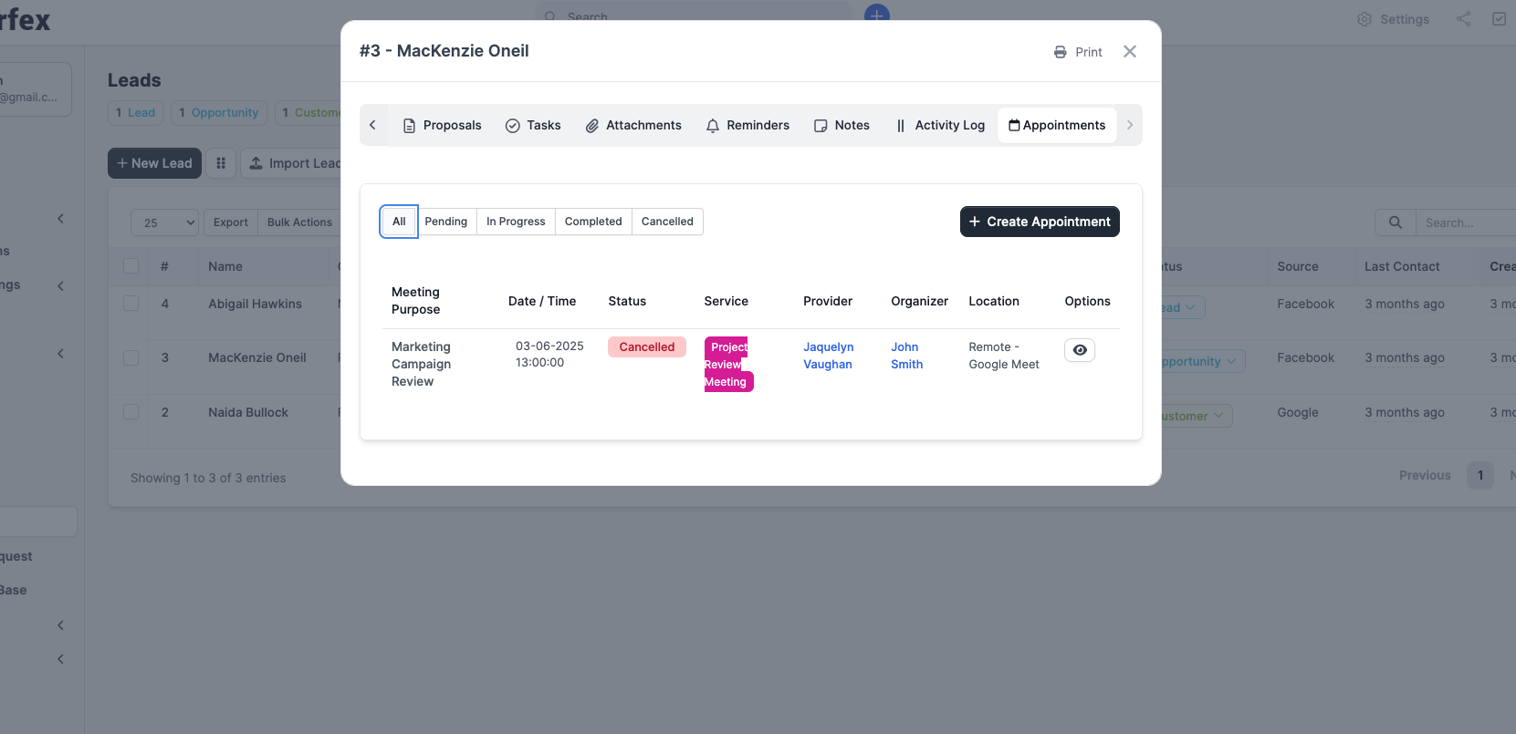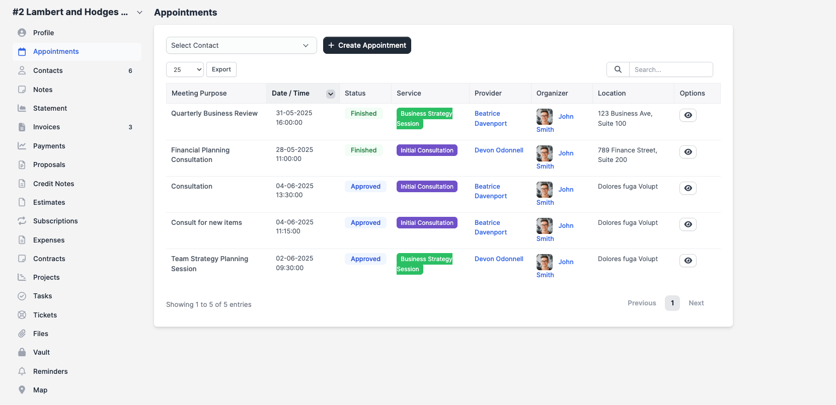 - Appointment History: Complete timeline visible in client profiles with detailed tracking