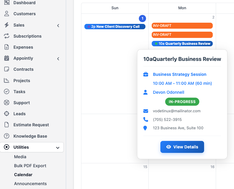 - Convert to Invoice: Transform completed appointments into invoices with pre-filled service details and client information