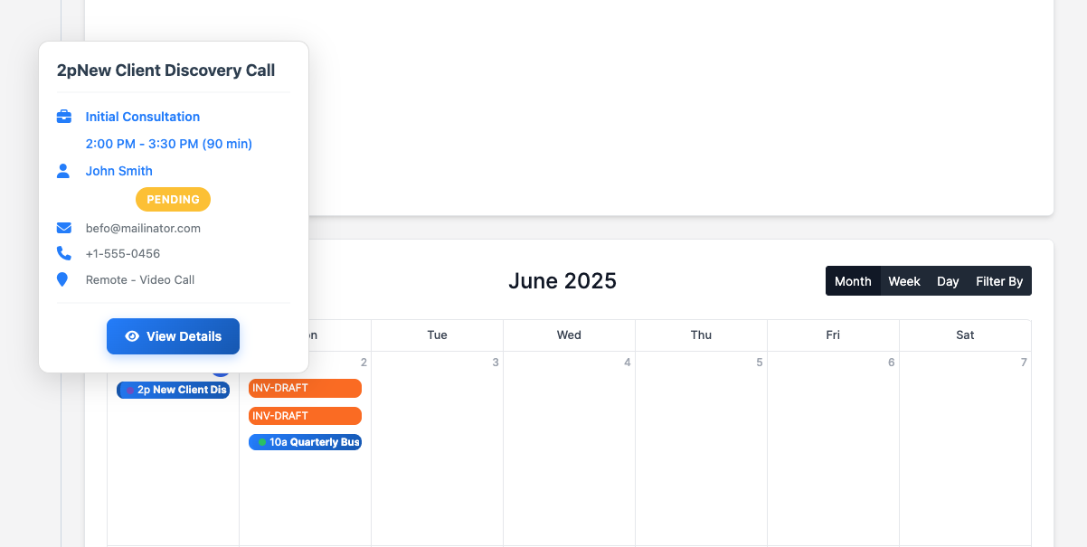 - Interactive Calendar Tooltips: Beautiful hover tooltips showing appointment details with quick actions