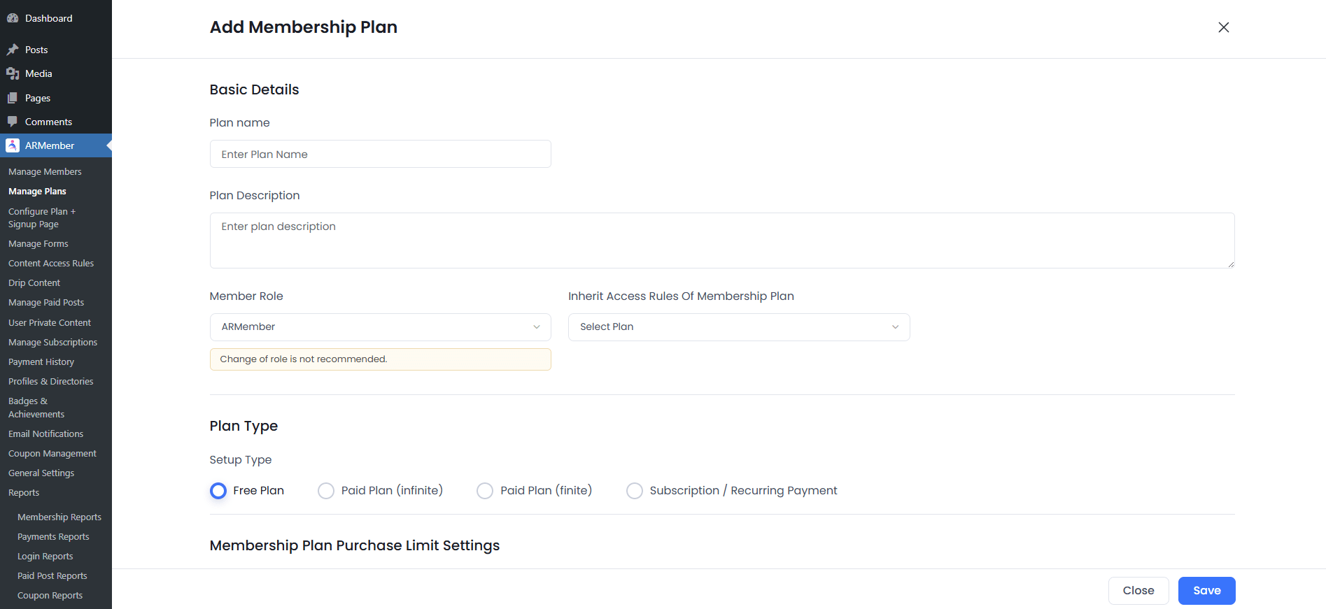 Manage Multiple Plans: With ARMember, you can set up as many free and paid membership plans as required from the Membership Setup Wizard. You can create a plan of four different types. A Free Plan, Paid (Infinite), Paid (Finite), and lay down a membership subscription model with Recurring Payment Plan. Set up duration for finite plans and also provide options to upgrade and downgrade at the end of the period.