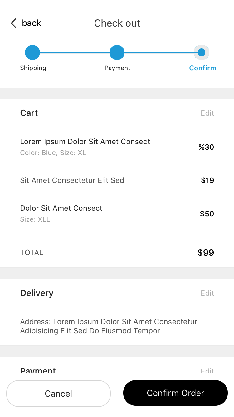 – Checkout page: shipping address, payment info, confirm & complete