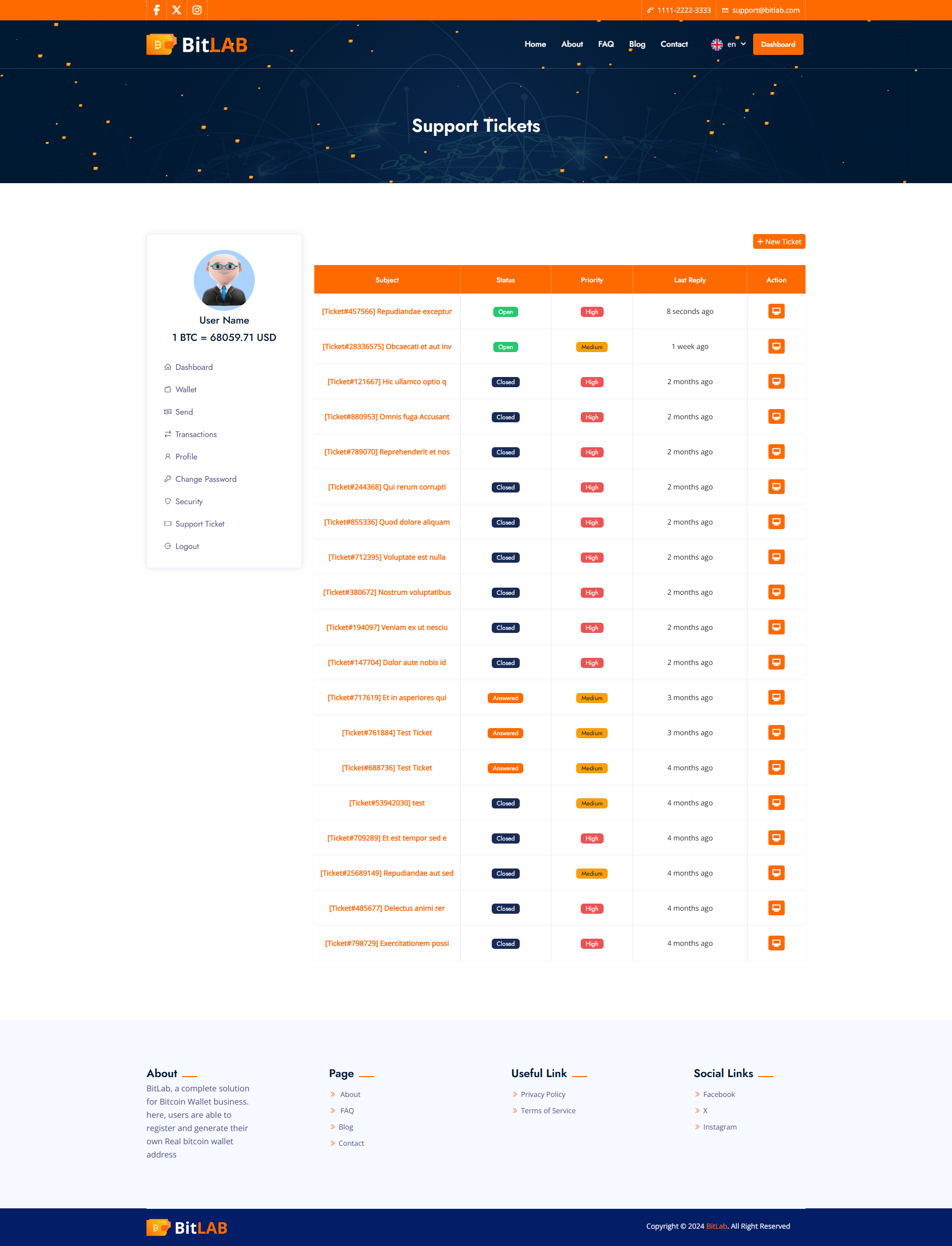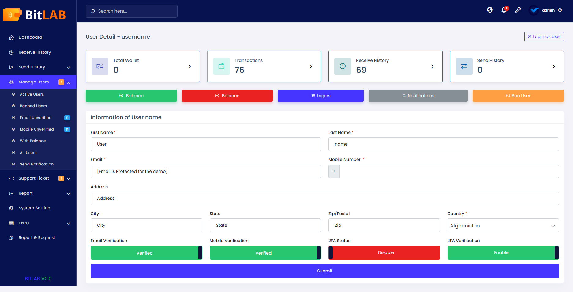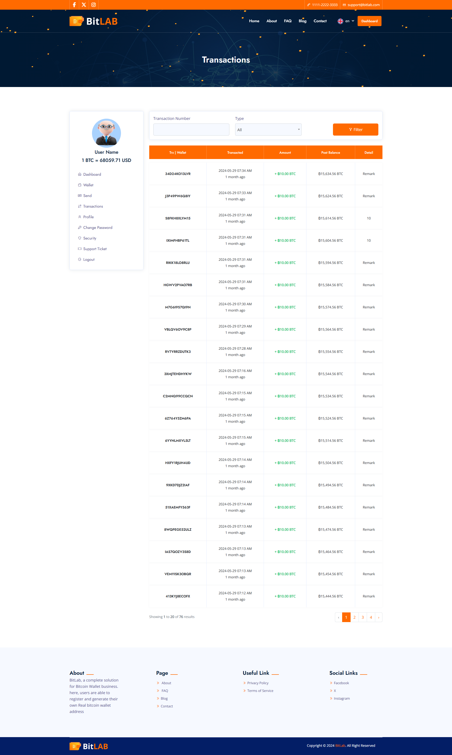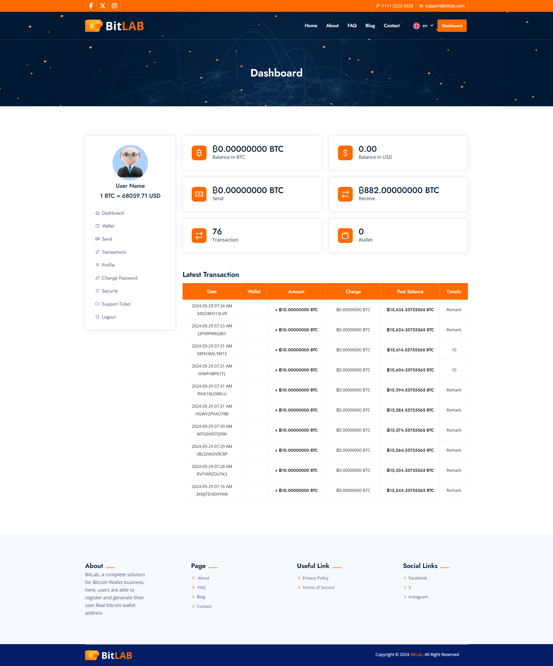Are you looking for a complete Bitcoin Wallet system for your business, then you are in the right place. No need to pay thousands of dollars to hire developers to build your Bitcoin Wallet. BitLab may assist you to handle unlimited users, wallet address, send, receive, able to accept payment, cryptos, and more. the ready-to-go solution, takes only a few minutes to set up your website with our system. we also here to provide you best support, installation, and customization if you need it. hurry up, get your copy and start your Bitcoin Wallet website today.