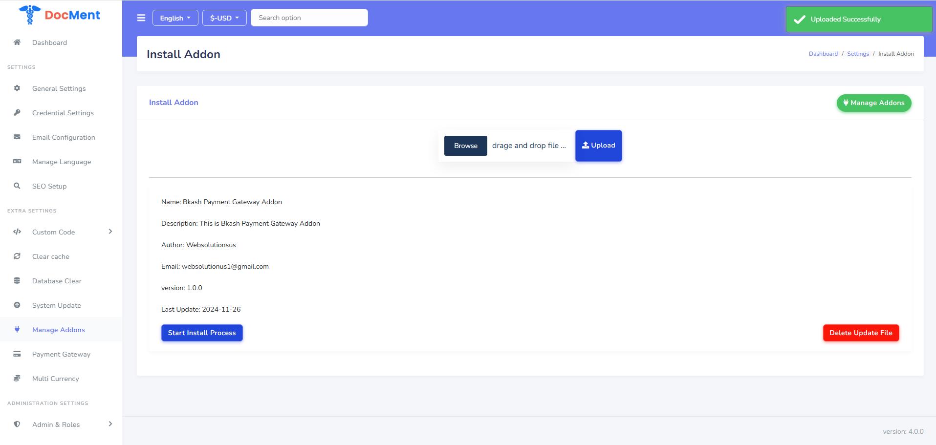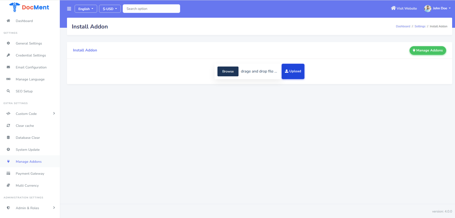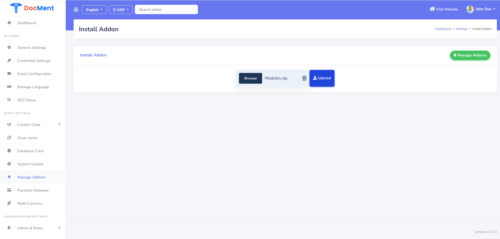 Compatibility: This addon is compatible with DocMent version 4.0.0 and above. If you are using an older version, we recommend updating to the latest version before installing this addon. Please refer to the official DocMent upgrade documentation for guidance on updating your system