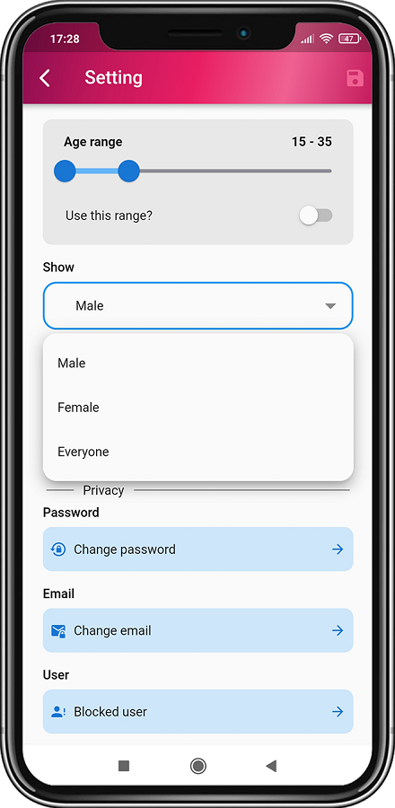- Control discovery such as, maximum distance, age range, show users by gender.