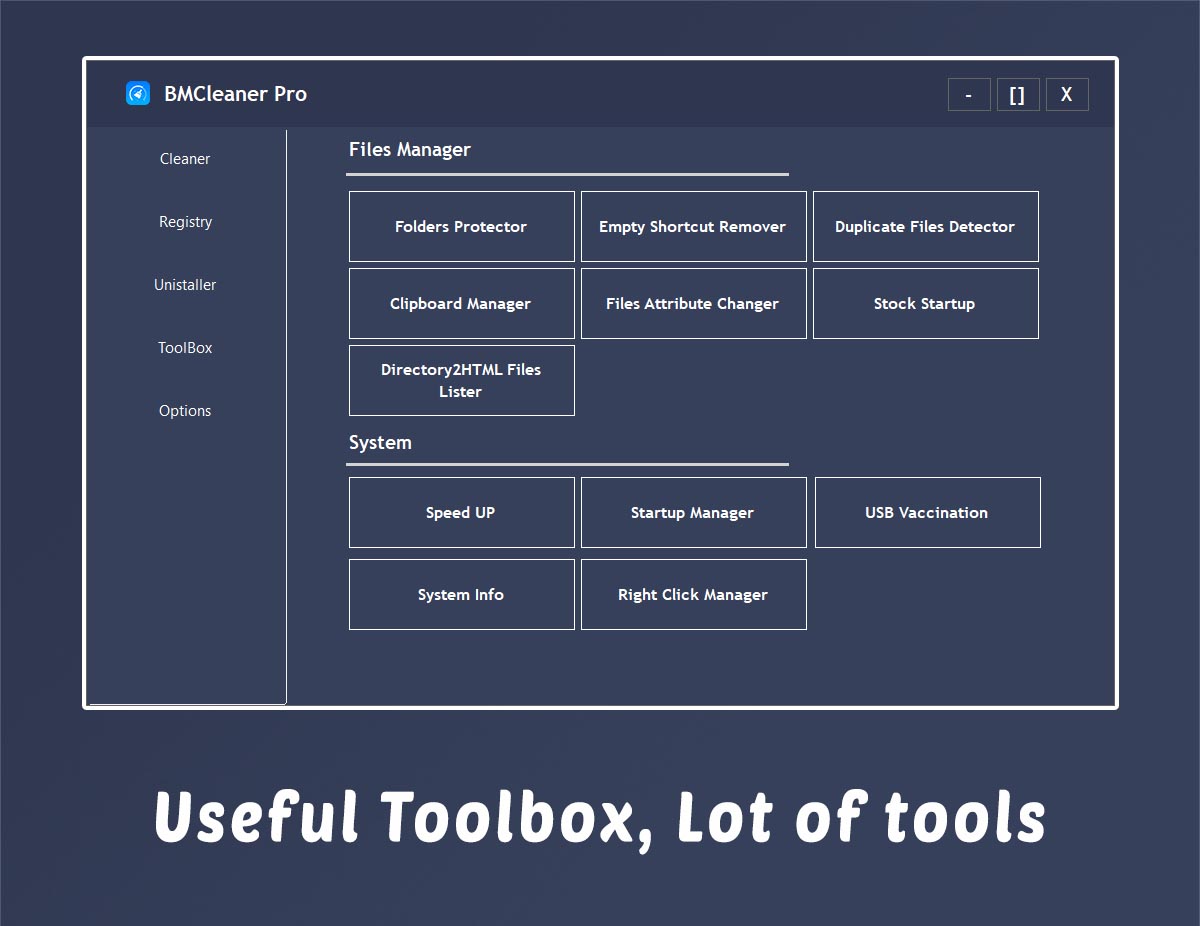 BMCleaner Pro is a Windows Application that helps you to control and speed up your PC through cleaning Junks of System, Utilities, Browsers… and fixing your Registry Problems, and uninstalling unnecessary programs on your pc. BMCleaner Pro has a useful toolbox with 12 tools:- Folders Protector: Hide your folders with a password