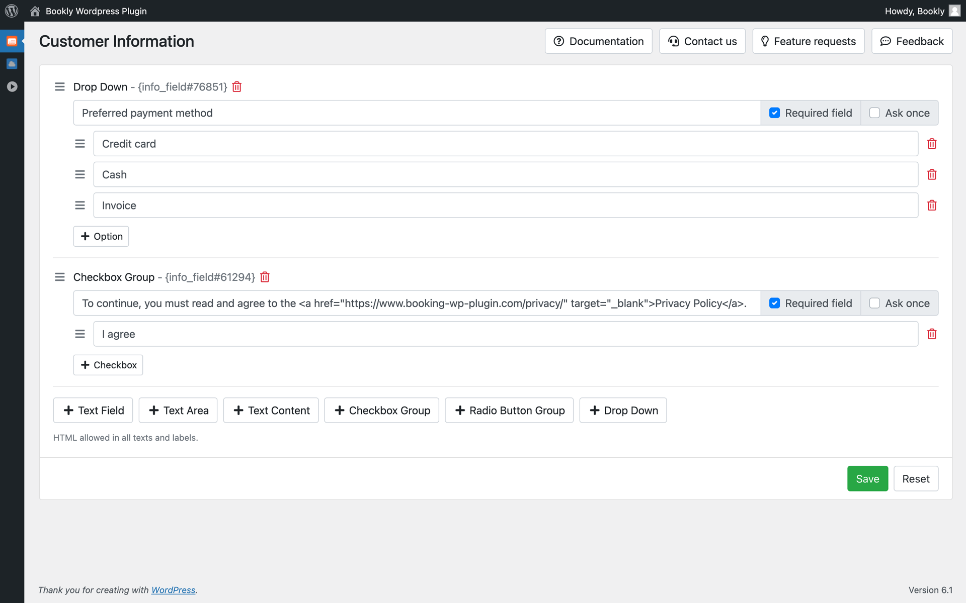 Need specific fields or records on a client profile in Bookly? Bookly Customer Information (Add-on) allows you to create multiple custom fields of different types that will appear on the Details step of the booking form. Once a booking is complete, the custom information entered by the client will be added to their profile in Bookly for future reference.