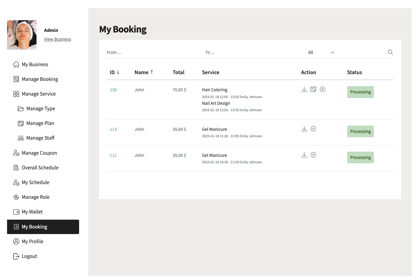 - Perform actions like downloading, canceling bookings, and changing times & dates of bookings