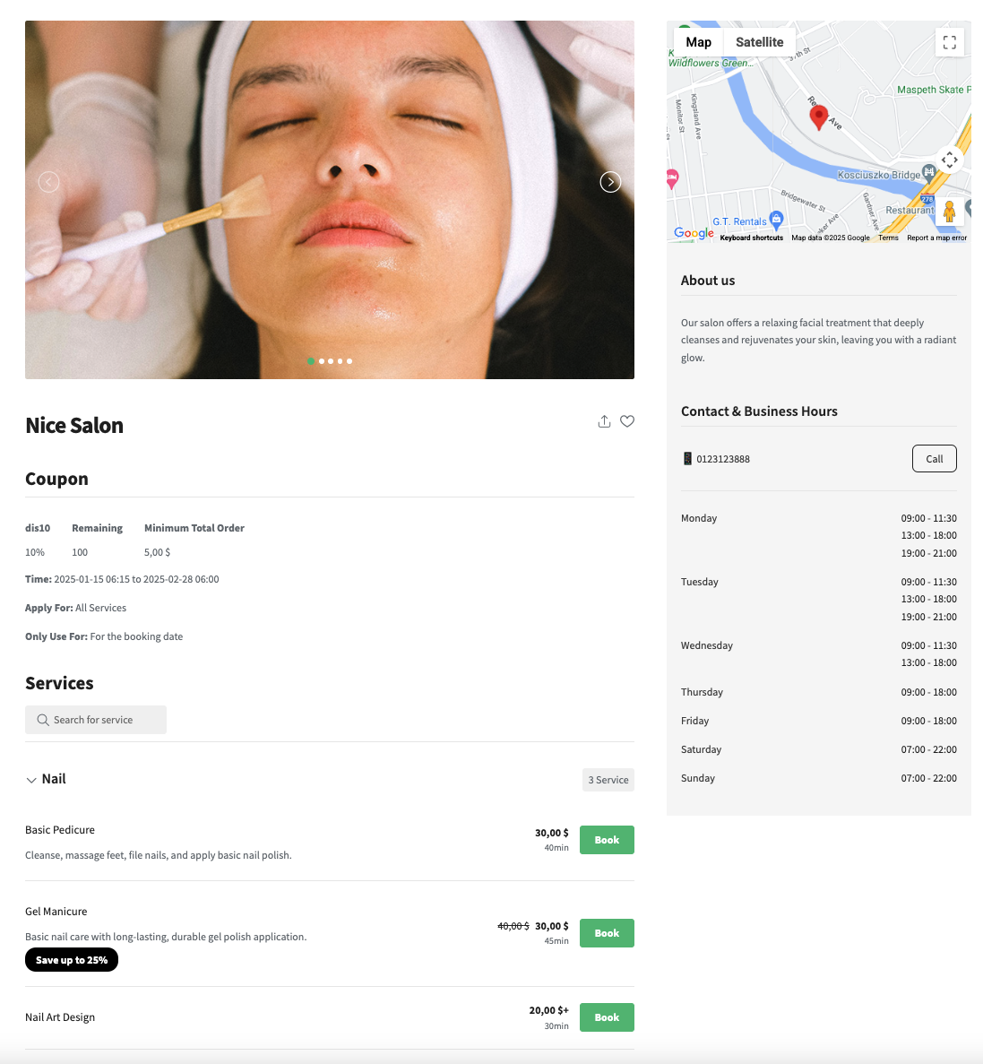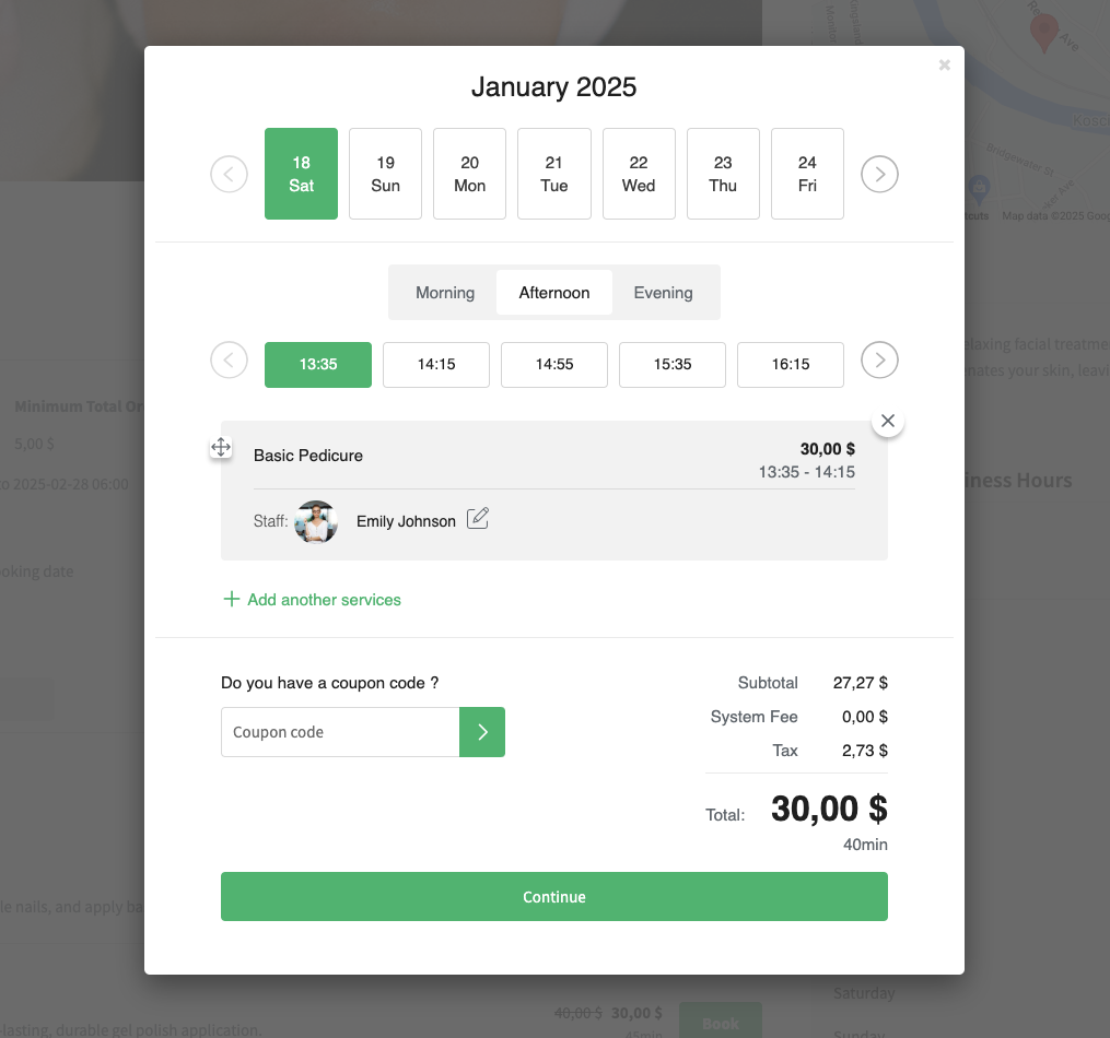 Enable customers to select their preferred time and date, book multiple services in one transaction, apply discount coupons, and view a detailed breakdown of their total cost.