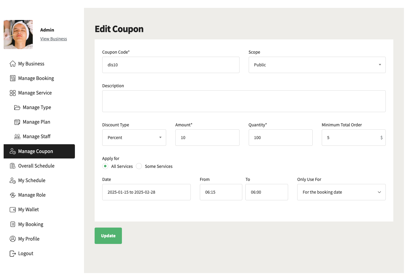- Coupon Codes: Create coupons in special time periods applicable to all or some selected services.