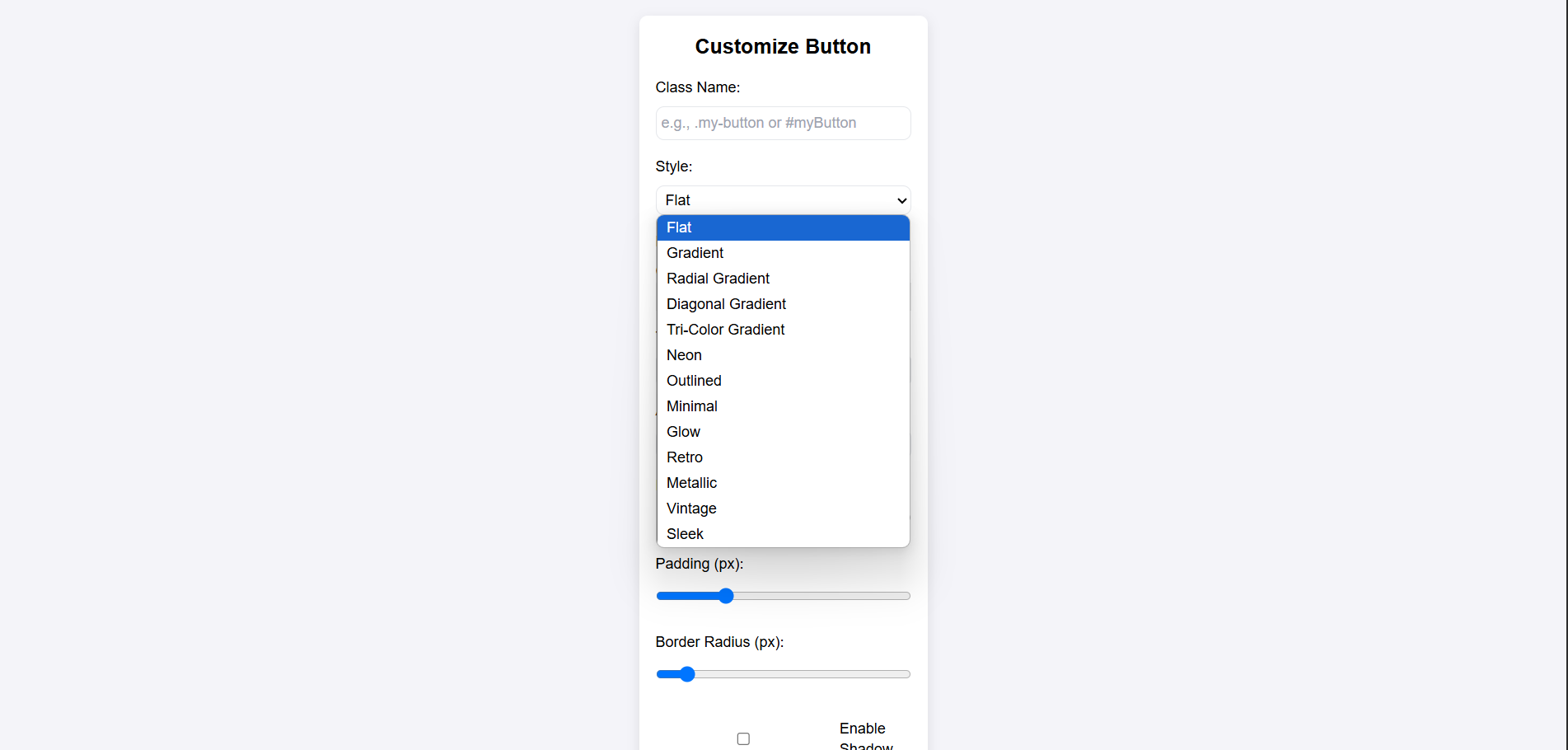 Elevate your website with ButtonBlaze, the ultimate tool for creating stunning, professional buttons! With 13 unique styles(Flat, Neon, Sleek, Vintage, and more) and 9 dynamic hover animations (Bounce, Glow, Ripple, etc.), ButtonBlaze makes button design effortless. Customize font size (12–24px), border width (1–5px or 0–3px for Sleek), and shadows (0–20px blur), plus Sleek options like bold text, underlines, and borders. Enjoy teal-time previews and one-click CSS export for seamless integration.