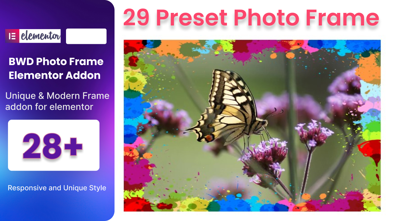 - Photo Frame – BWD Photo Frame is a lightweight Elementor-based WordPress plugin to add an attractive photo frame to your website. 29 unique preset photo frames look awesome.