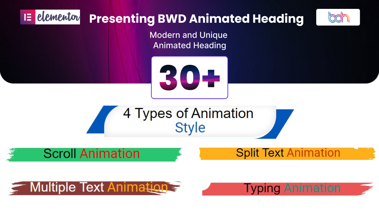 - Animated Heading – BWD Animated Heading” is a lightweight Elementor base WordPress plugin to add an attractive Animated Heading to your website. It has 31 preset styles.
