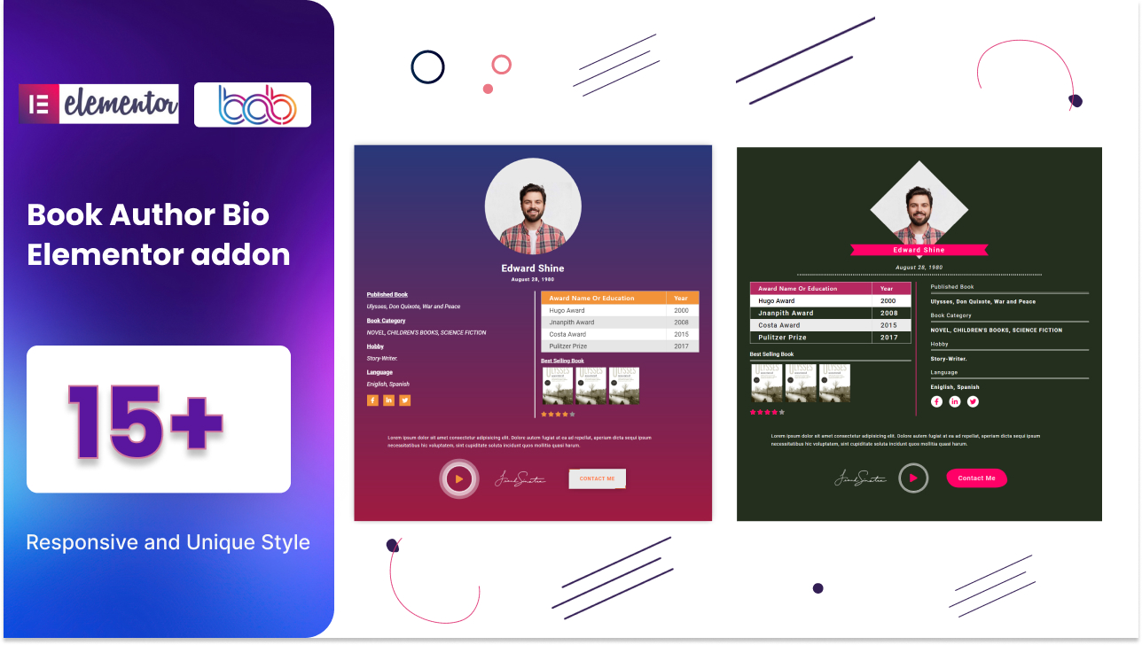 - Book Author Bio – Book Author Bio is a lightweight Elementor-based WordPress plugin to add an attractive Author Biography to your website. 15+ unique preset bio styles look awesome.