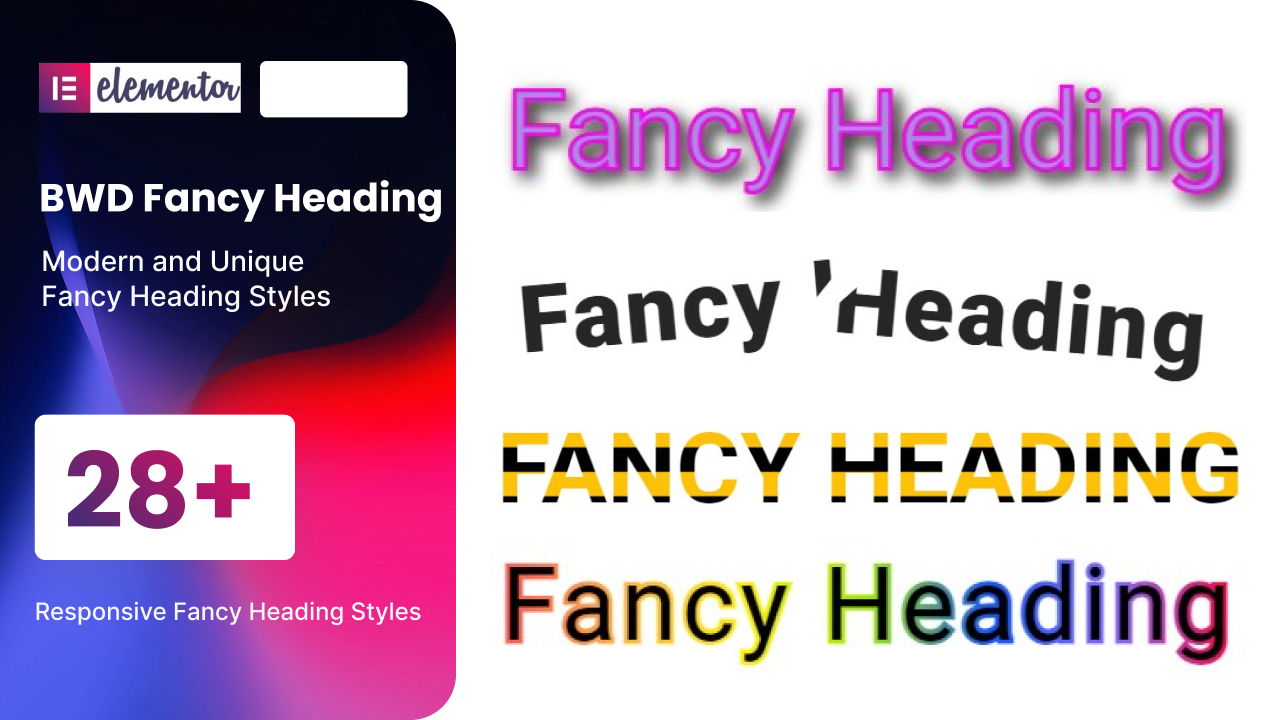 - Fancy Heading – BWD Fancy Heading” is a lightweight Elementor base WordPress plugin to add an attractive Fancy Heading to your website. There are 28+ unique preset Fancy Heading that looks awesome.