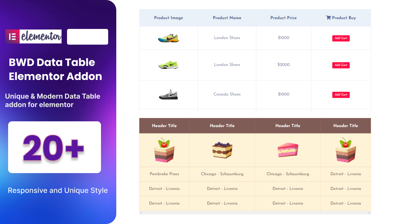 - Data Table – BWD Data Table is a lightweight Elementor base WordPress plugin to add an attractive Data Table to your website. 20+ unique preset Data tables look awesome.