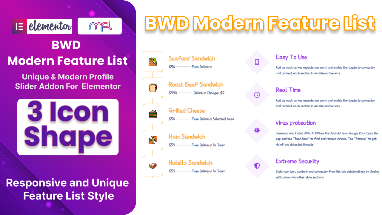- Modern Feature List – Elevate your Elementor web design with the “Modern Feature List Addon.” Effortlessly craft eye-catching feature lists, harnessing drag-and-drop simplicity and a treasure trove of customization options.