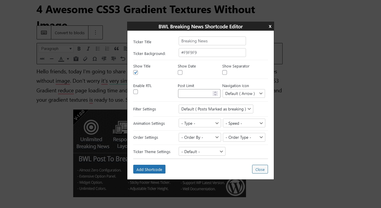 Visual shortcode editor allows you to insert breaking news shortcode in to posts/pages. You don’t need to copy/paste shortcode everytime.