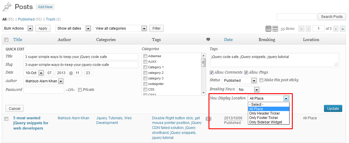 Post To Breaking News Manager is a powerful & premium WordPress plugin that allows you to display unlimited number of breaking news in your website. You can easily select & mark regular WordPress posts and then able to display them as breaking news in any page’s header, footer and sidebar areas.