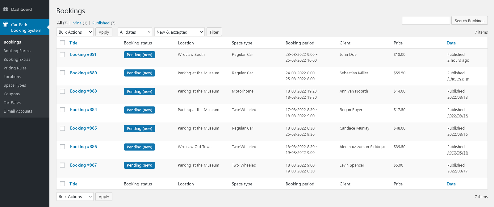 The Car Park Booking plugin allows you to create and customize unlimited booking forms with a variety of options such as default booking status, geolocation type, payment methods, coupon options, and more. See the complete list.
