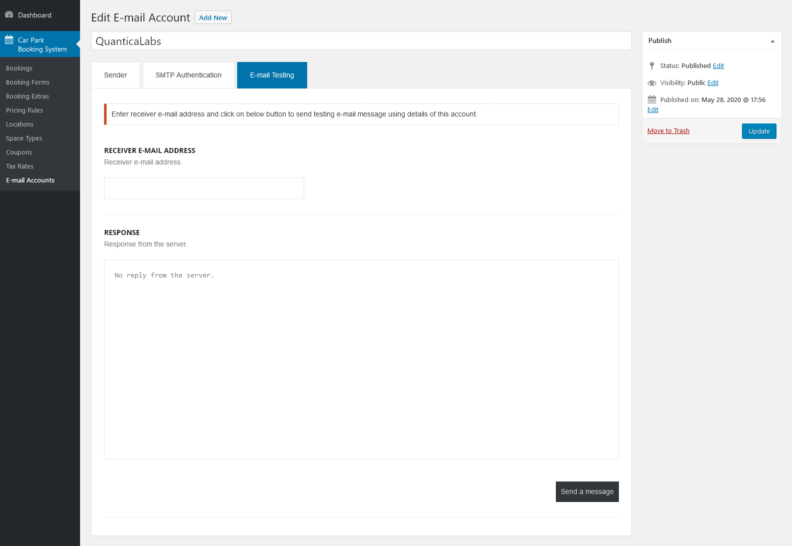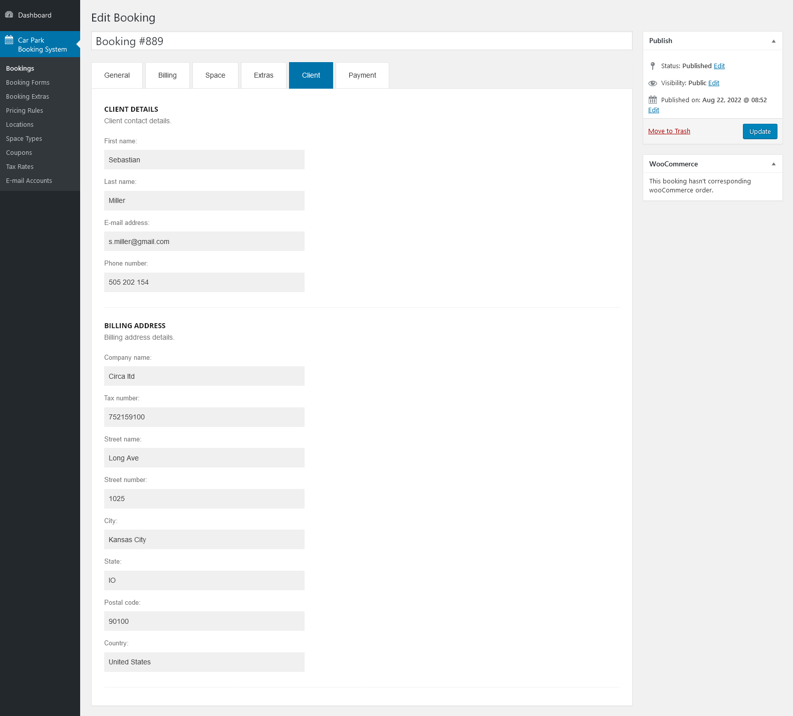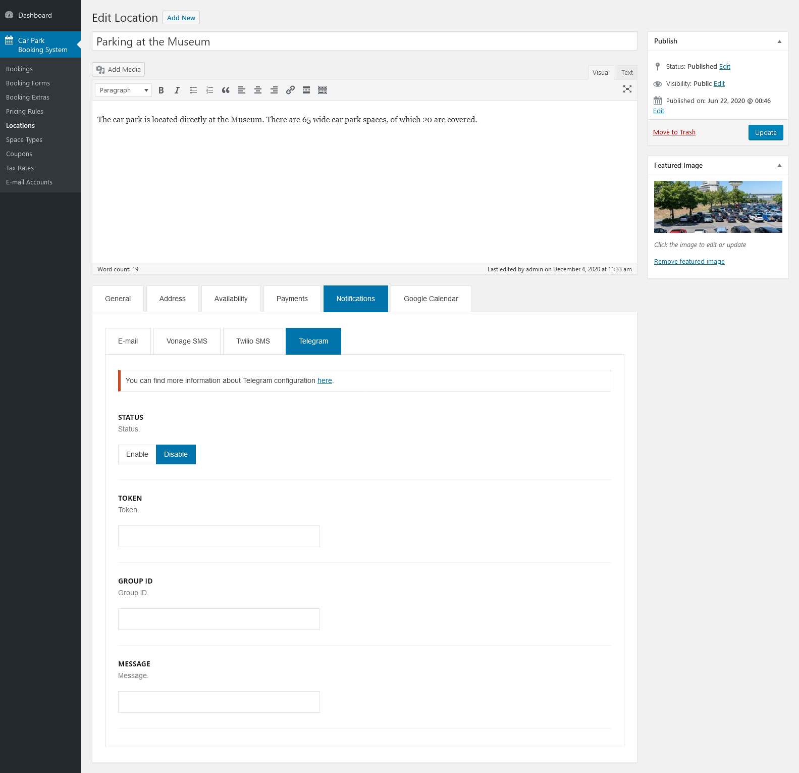 The plugin supports unlimited locations. Each location has assigned types of parking spaces along with their number, exact address, contact details, map coordinates, opening hours and dates excluded from the booking system, supported payment methods, booking notification options, google calendar options and many smaller but important options, such as minimum or maximum booking period, advance booking, etc.