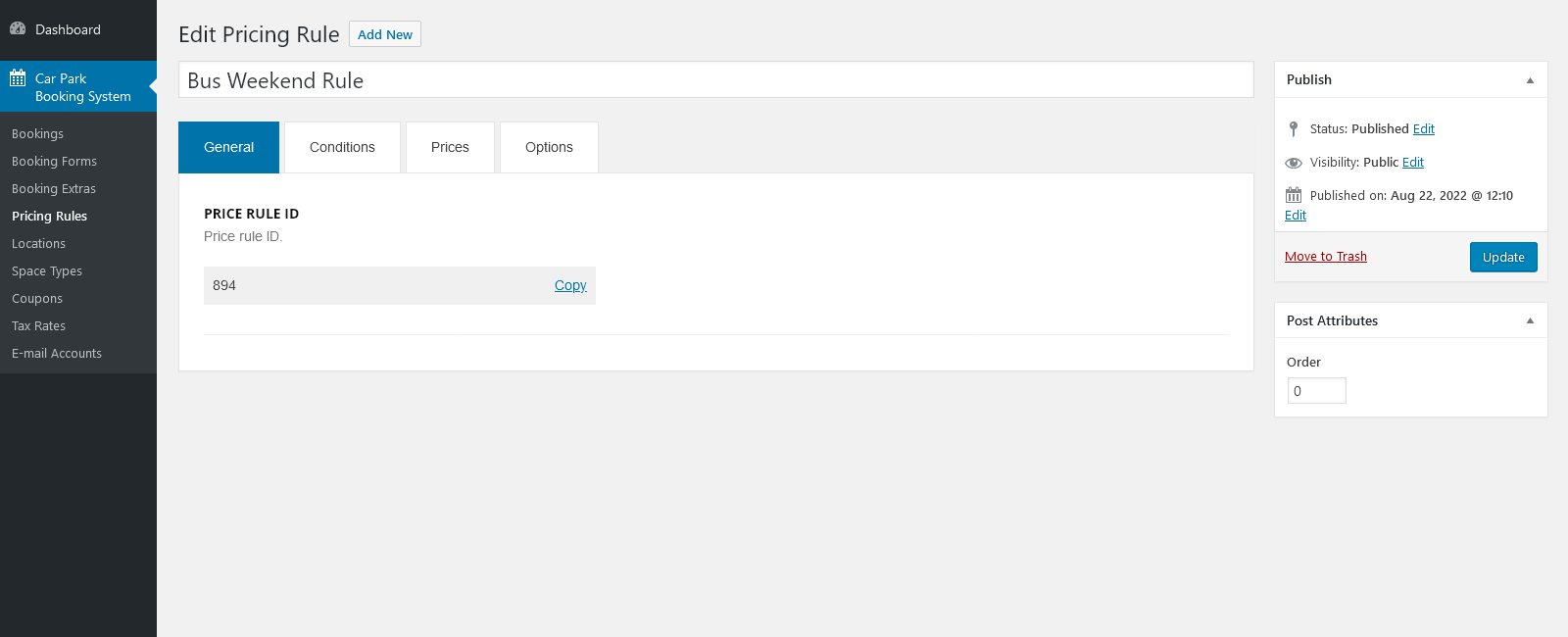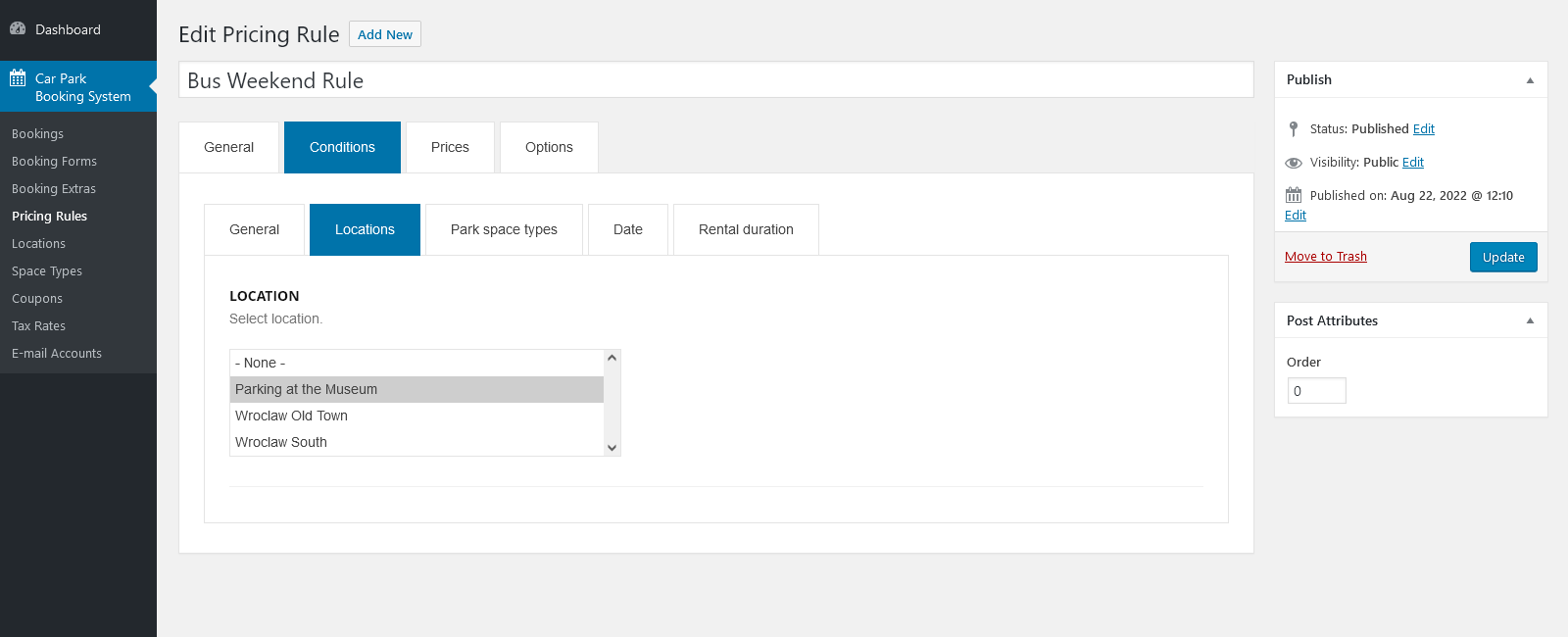 You can define your own pricing rules depending on the booking form, location, parking space type, start date of the rental period, duration of the rental, and time of entry and exit.