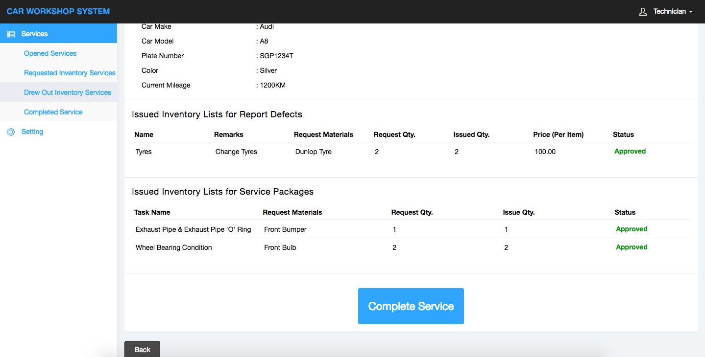 Technician only take care of check car and request material to Service Advisor and complete the service.