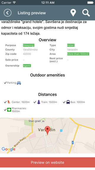 - location preview contains gallery, overview, amenities, distances, location map, agent details and link to location preview on website