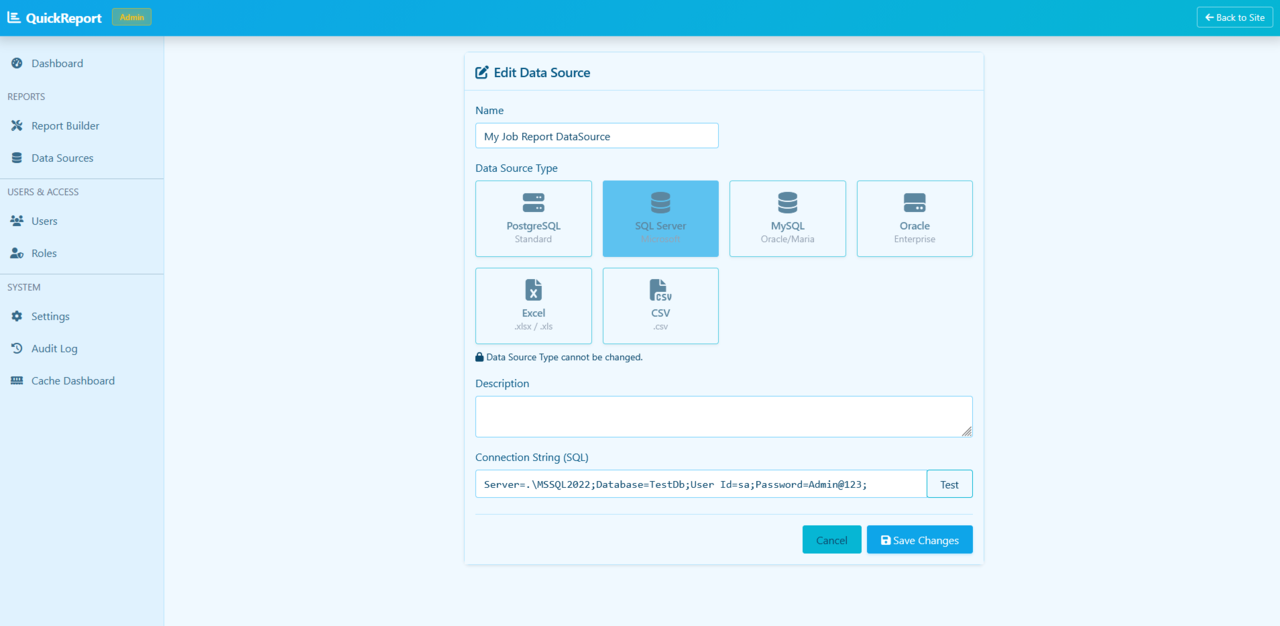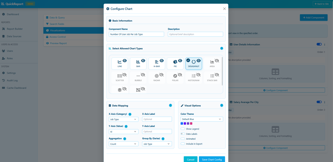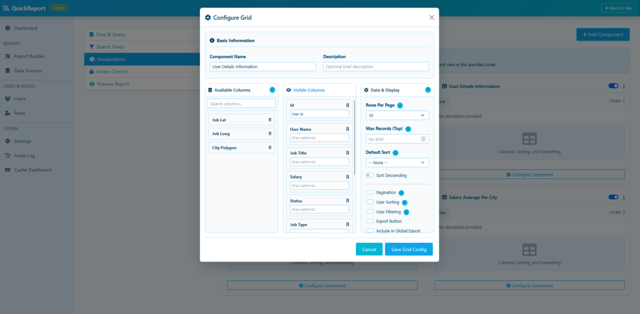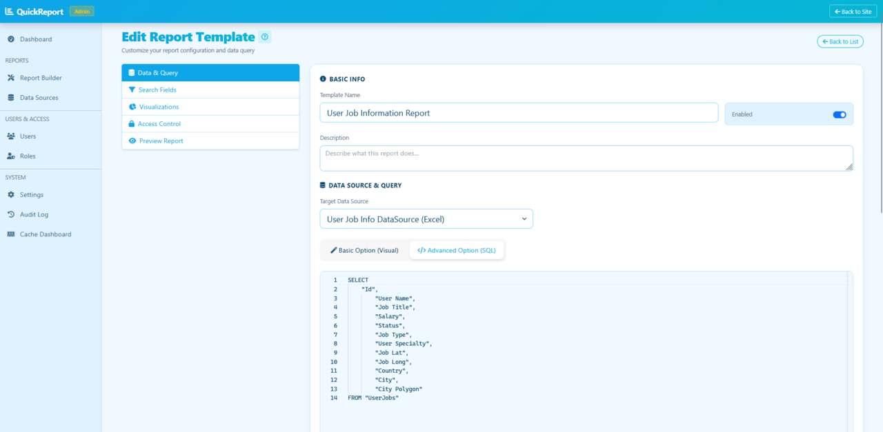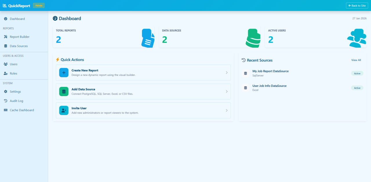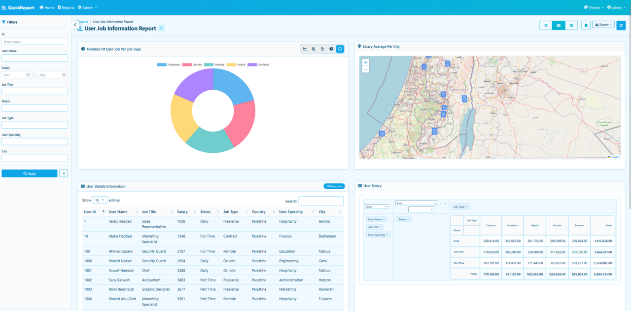QuickReport is a web-based dynamic report generator designed for small and medium-sized organizations to simplify data discovery. It enables users to create a variety of report types, including Tables, PivotTables, Charts, and Maps. Users can select data from multiple sources—such as Oracle, SQL Server, PostgreSQL, MySQL, or files like Excel and CSV—and generate fully dynamic, interactive reports.