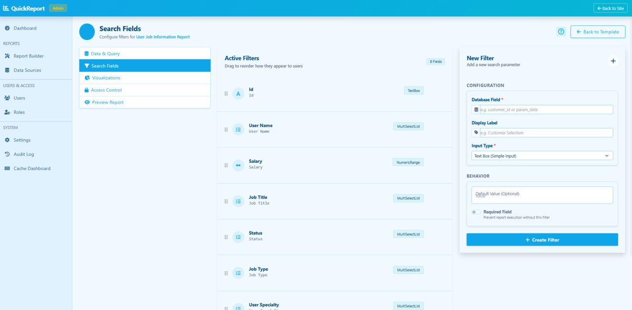 In addition, QuickReport allows the configuration of custom rules, permissions, and dynamic search fields for each report. Developed using .NET Core with a clean architecture, QuickReport provides a scalable, maintainable, and high-performance solution for modern reporting needs.