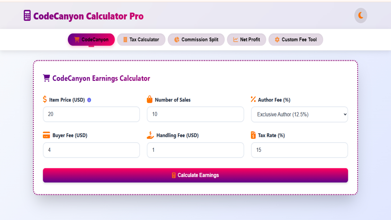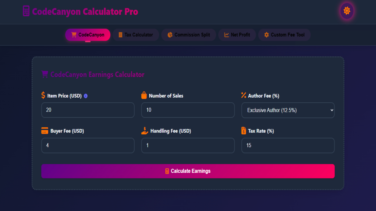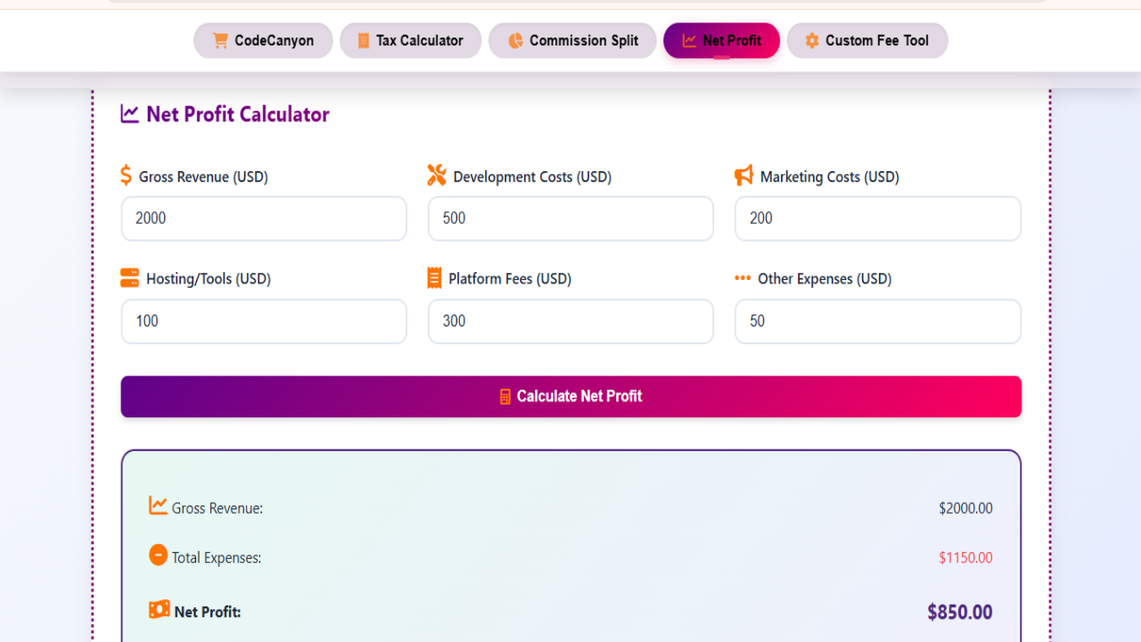 Outputs: Gross revenue (item price × sales volume). CodeCanyon fees (calculated based on author fee percentage). Tax deductions (based on input tax rate). Net earnings (gross revenue minus fees and taxes, adjusted for additional costs).