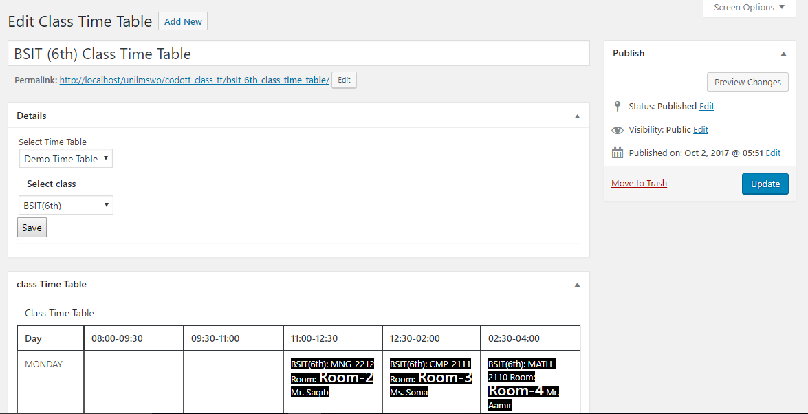 Once custom time table is created then go into CodoTimeTables-> Class Time Tables to create class time tables from custom time table.