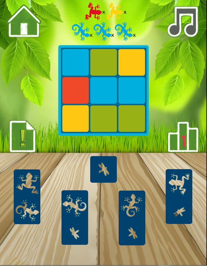 Game board with colored squares, 5 puzzle pieces with frogs, salamanders and transparent insects, consists of 60 challenges