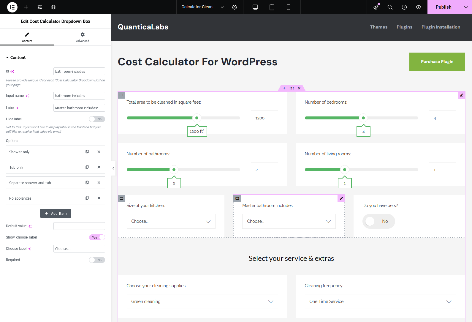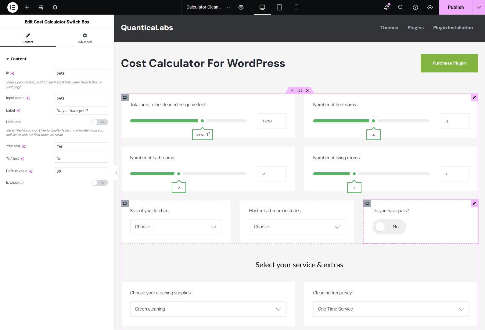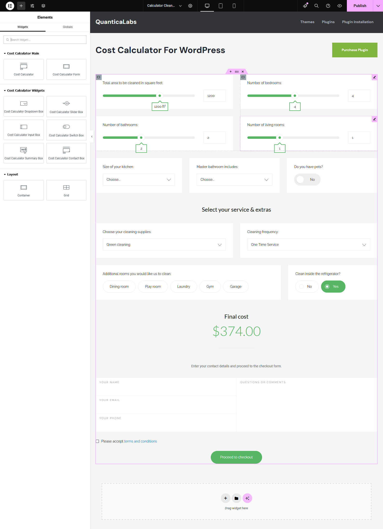 If you’re using the Elementor Website Builder for WordPress, the Cost Calculator plugin offers dedicated integration with 8 custom widgets: Cost Calculator, Form Container, Dropdown Box, Slider Box, Input Box, Switch Box, Summary Box, and Contact Box. These widgets allow you to visually build and customize calculator forms directly inside Elementor. See it in action.