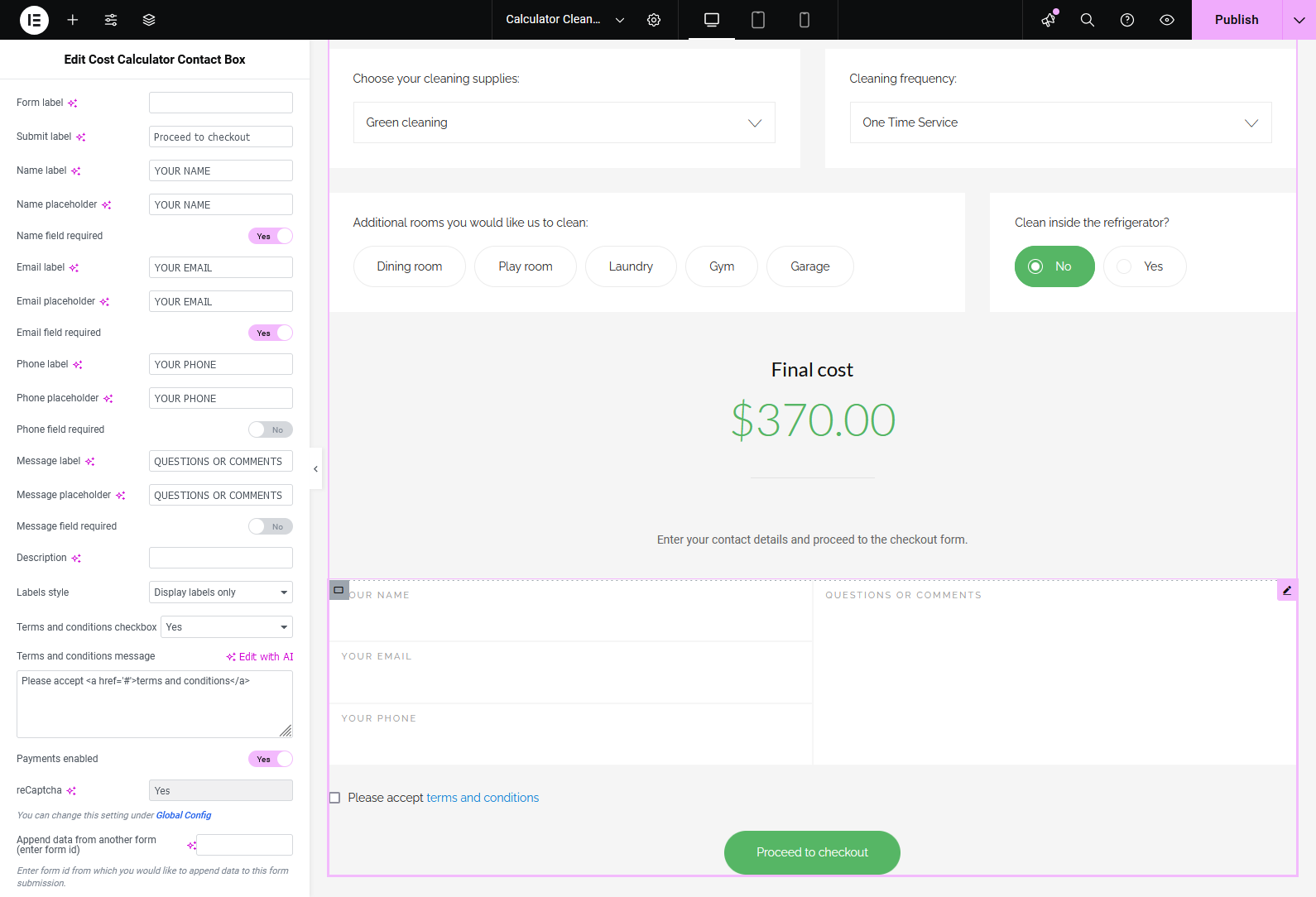 The Contact Details Box allows you to collect user contact information directly after the calculation is completed. It works as the final step of the form, enabling visitors to submit their details together with calculated data such as selected options or total cost.