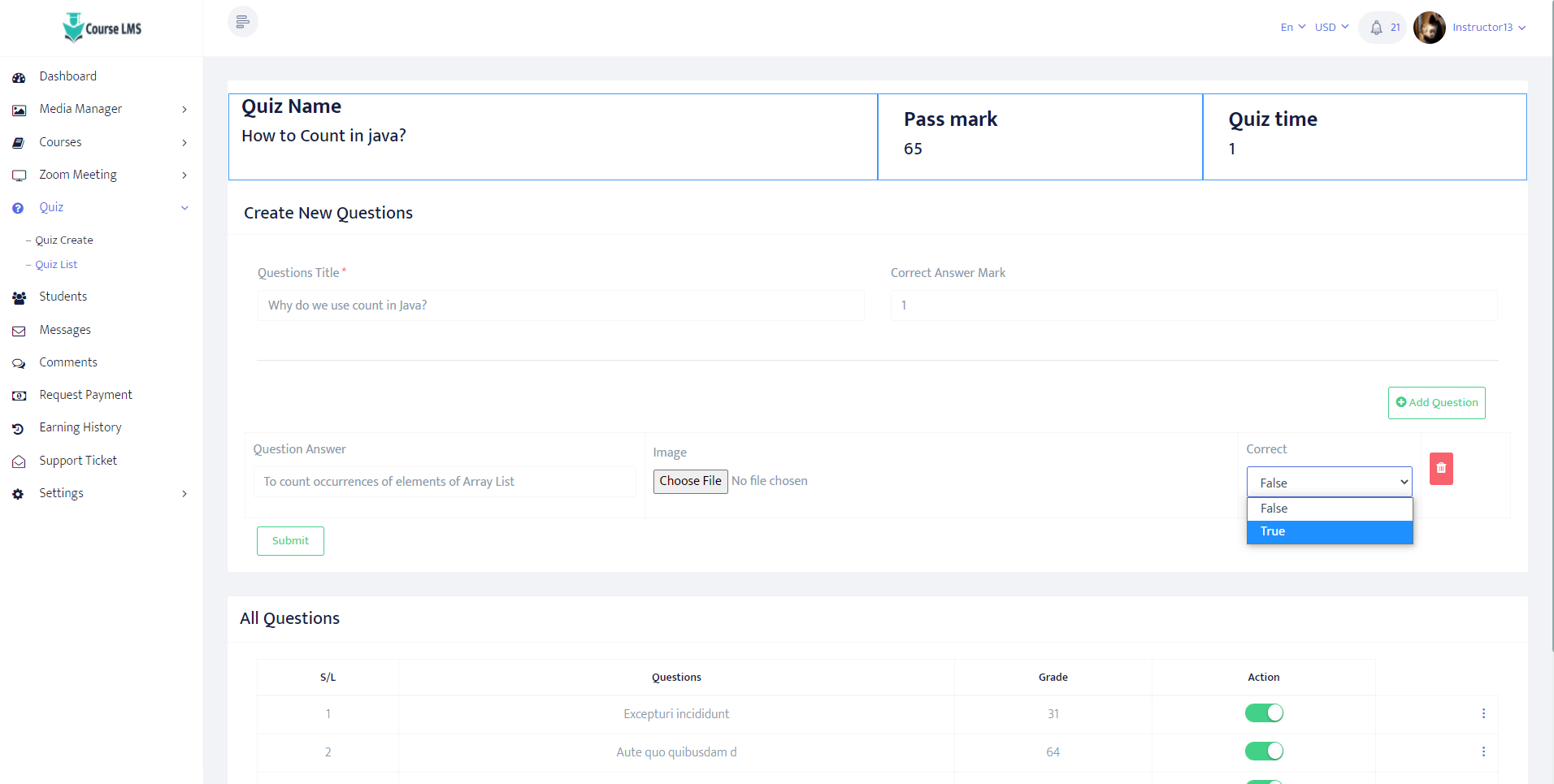 Instructors can create unlimited quizzes and assign them to their courses.