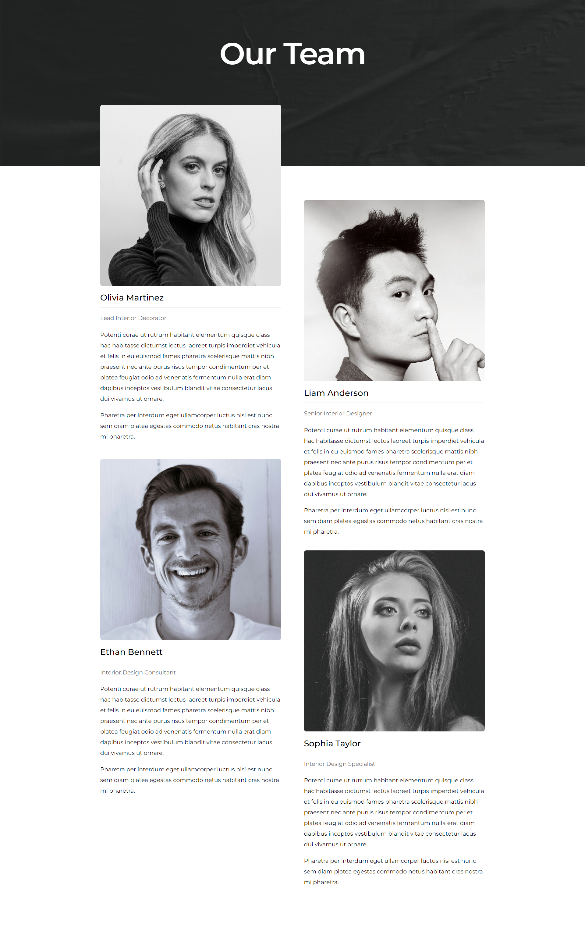 Introducing Creative HTML Team Section Templates – a collection of beautifully designed and responsive team sections tailored for various industries. Whether you’re an architect, business professional, chef, corporate manager, fitness trainer, jeweler, real estate agent, salon owner, SEO expert, accountant, agency, data analyst, doctor, or pizza chef, we have a team section template just for you.