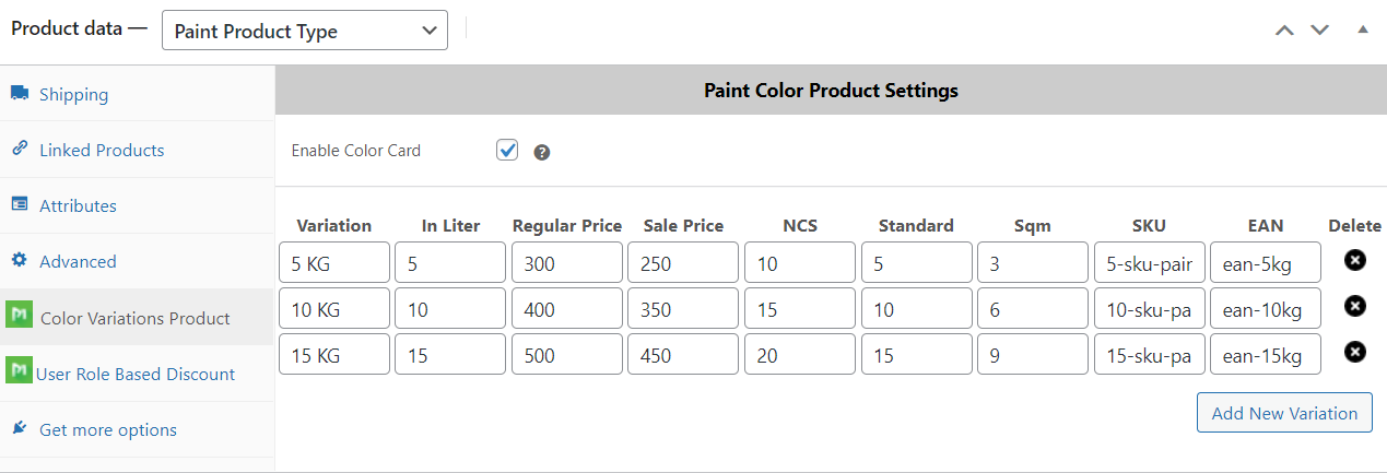 The The Custom Paint Variation for WooCommerce allows you to create custom variations of paint products in different weights along with sales and regular prices. You can also set how many litres are included and how much area is covered by a specific variation total. There is no limit to adding custom paint variations, you can add as much as you want for a specific product.