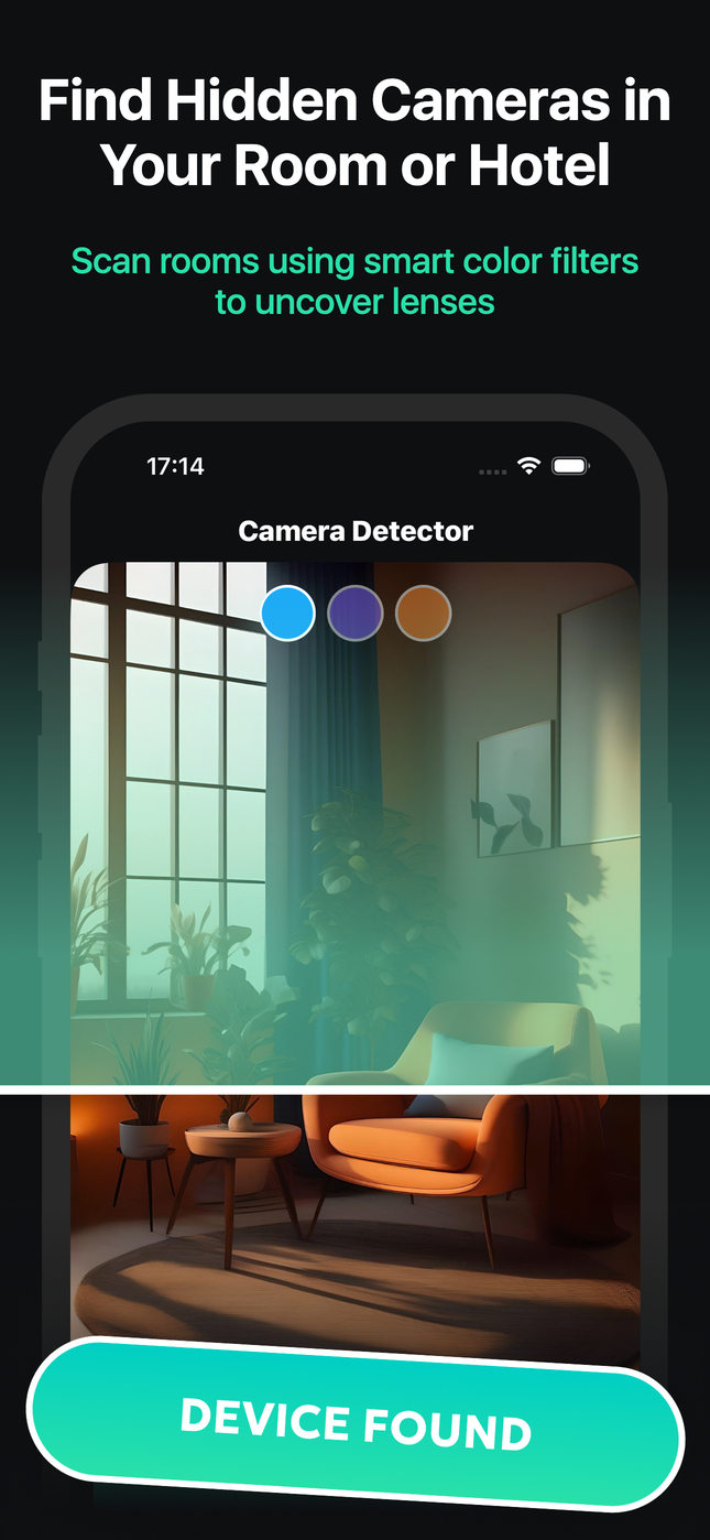 • Hidden Camera Detection – Visual detection using red, blue, and purple camera filters to help users spot reflective lenses manually.